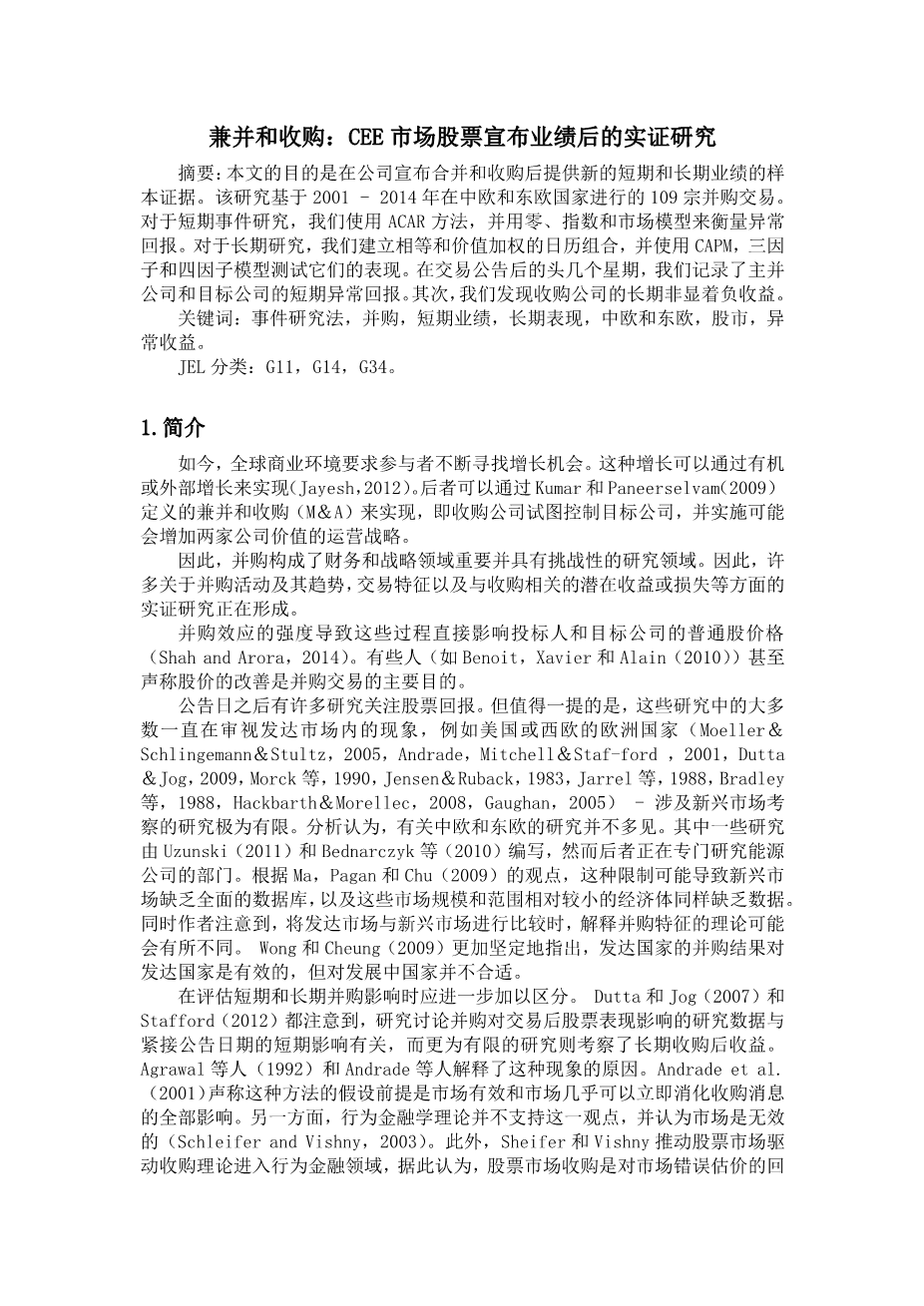借壳上市公司财务绩效及影响因素研究外文翻译资料 2022-07-12 14:37:33 英语原文共 20 页,剩余内容已隐藏,支付完成后下载完整资料 英语原文共 7 页,剩余内容已隐藏,支付完成后下载完整资料资料编号:[9609],资料为PDF文档或Word文档,PDF文档可免费转换为Word 原文和译文剩余内容已隐藏,您需要先支付 30元 才能查看原文和译文全部内容!立即支付 发小红书推广免费获取该资料资格。点击链接进入获取推广文案即可: Ai一键组稿 | 降AI率 | 降重复率 | 论文一键排版 PREVIOUS NEXT 您可能感兴趣的文章 哈佛分析框架下的企业经营管理分析:以迪斯尼公司为例外文翻译资料 某些财务指标对罗马尼亚能源部门股本回报率的影响——基于Dupont分析的竞争方法外文翻译资料 企业并购中的金融风险控制与规避措施外文翻译资料 马来西亚公司的企业风险管理做法外文翻译资料 伊斯兰金融机制下的中小企业融资困境分析——以苏丹伊斯兰银行为例外文翻译资料 塞尔维亚肉类行业盈利能力分析外文翻译资料 现金流量表与企业价值:来自台湾的证据外文翻译资料 企业价值最大化视角下的财务风险控制与防范研究外文翻译资料 财务报表舞弊的原因、后果及防范外文翻译资料 澳大利亚借壳上市:探索性分析外文翻译资料
