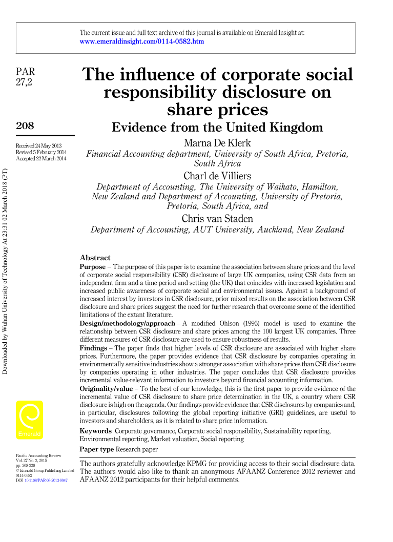 Villiers (2012年)审查了南非公司。Shadewitz和Niskala(2010)提供的统计证据表明,企业社会责任披露和财务会计信息的综合作用更好地解释了市场属性,而不是只关注财务信息。这些研究的研究目的,虽然在某种程度上是不同的,但都涉及到公司社会责任披露(或其中的领域)与股票价格/市场价值之间的关系。