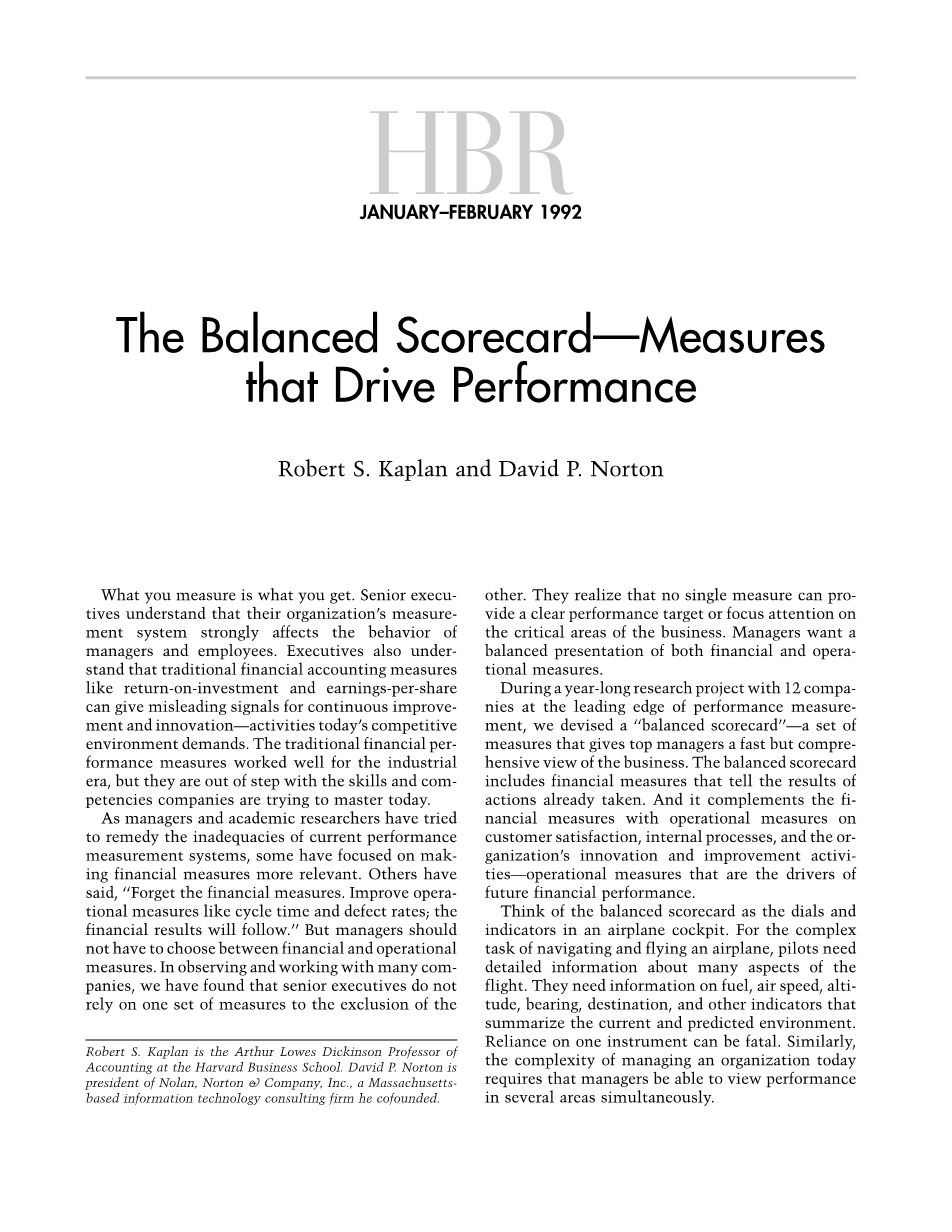在对12家公司进行的为期一年长的研究项目,我们站在了绩效评价研究的前端,我们发现了“平衡计分卡法”—这是一套能够为顶级管理者提供快速并且全面商业视野的方法。平衡计分卡法包括能够阐明已采取措施的成果的财务指标,并且它用经营性指标从客户满意度、内部流程和公司学习革新与成长等活动来对财务指标进行补充—这些经营性指标用来衡量未来的财务绩效。