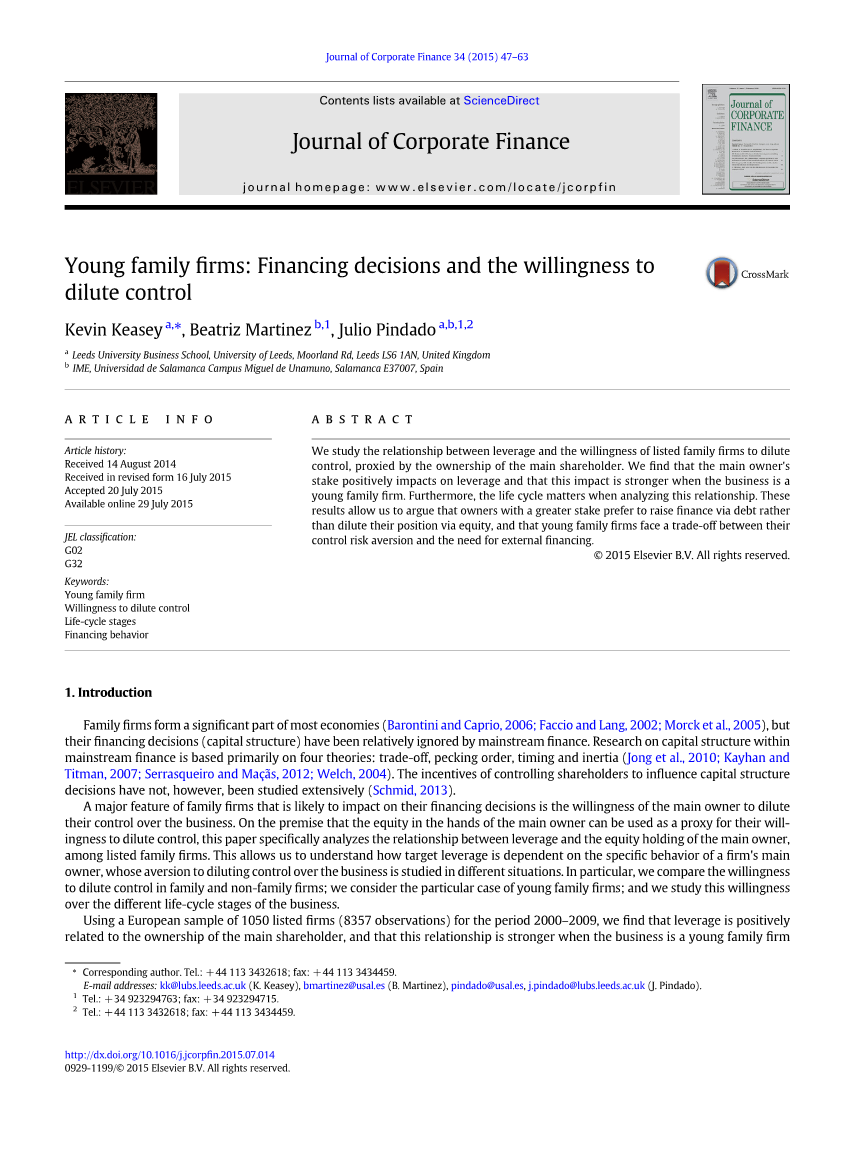 本文研究了上市家族企业的杠杆率与控股股东稀释控制权意愿之间的关系。我们发现,当企业是一个年轻的家族企业时,主要所有者的持股对杠杆率有积极的影响,而且这种影响更大。此外,在分析这种关系时,生命周期也很重要。这些结果使我们可以认为,拥有更多股权的所有者更愿意通过债务融资,而不是通过股权稀释他们的地位,并且年轻的家族企业面临着控制风险厌恶和外部融资需求之间的权衡。