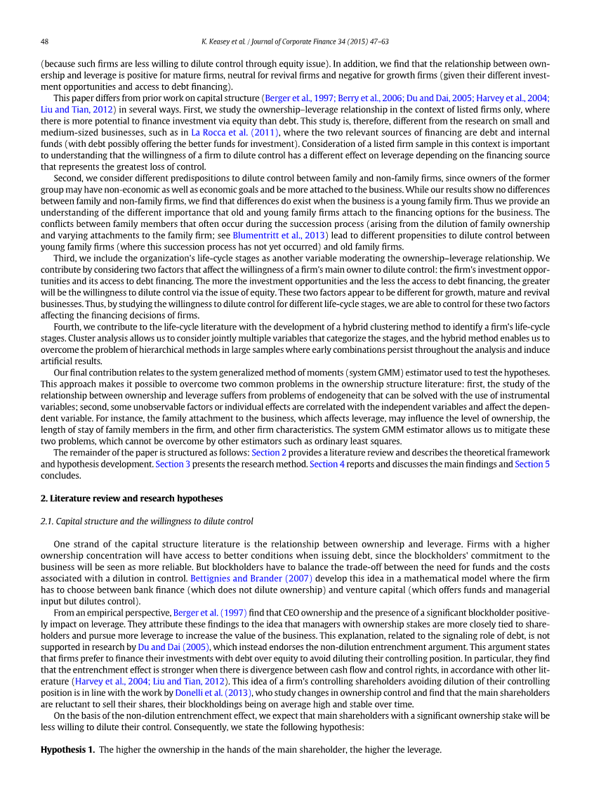 本文不同于以往关于资本结构的研究(Berger等,1997;Berry等,2006;Du和Dai,2005;Harvey等,2004;Liu和Tian,2012)在几个方面。首先,我们只研究上市公司的所有权-杠杆关系,其中通过股权融资比通过债务融资更有潜力。因此,本研究不同于La Rocca等人(2011)对中小企业的研究,在他们的研究中,中小企业融资的两个相关来源是债务和内部资金(债务可能提供更好的投资资金)。在这种情况下,考虑上市公司样本是很重要的,要理解的是,企业稀释控制的意愿对杠杆有不同的影响,这取决于代表最大控制权损失的融资来源。