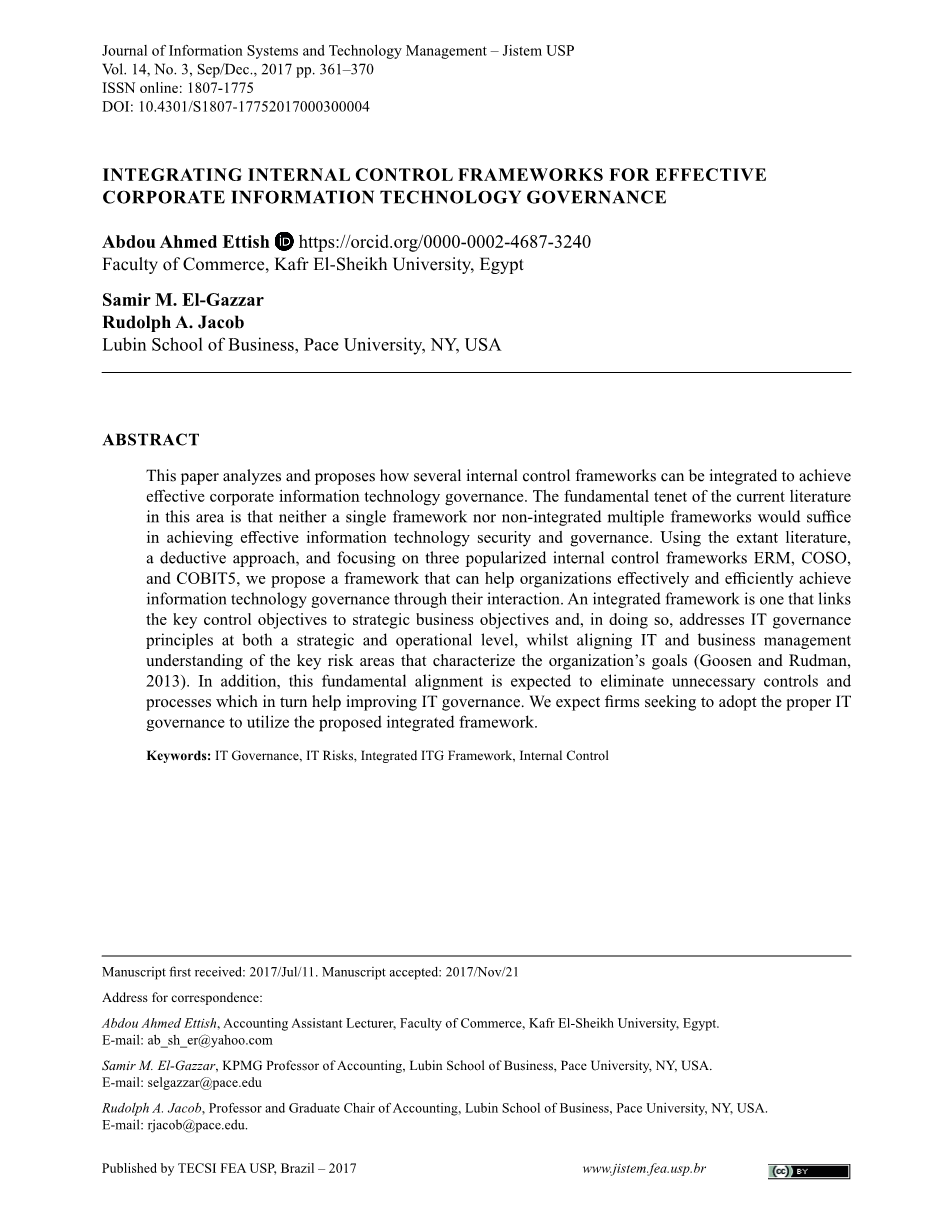 本文的范围仅限于COSO报告(1992年发布,2013年修订)和2004年引入的ERM。此类框架代表了现在引用最广泛的模型。但是,由于它们高度凝结,并且无法根据所需的特异性水平确定控制目标,因此其有效性受到一定程度的限制(Rubino和Vitolla,2014)。确实,在当前情况下,在IT治理中达到最佳有效性水平的可能性不大。因此,本文结合了COBIT5,该COBIT5提供了一组详细的潜在客户控制和清单,从而有可能克服这些框架的弱点。