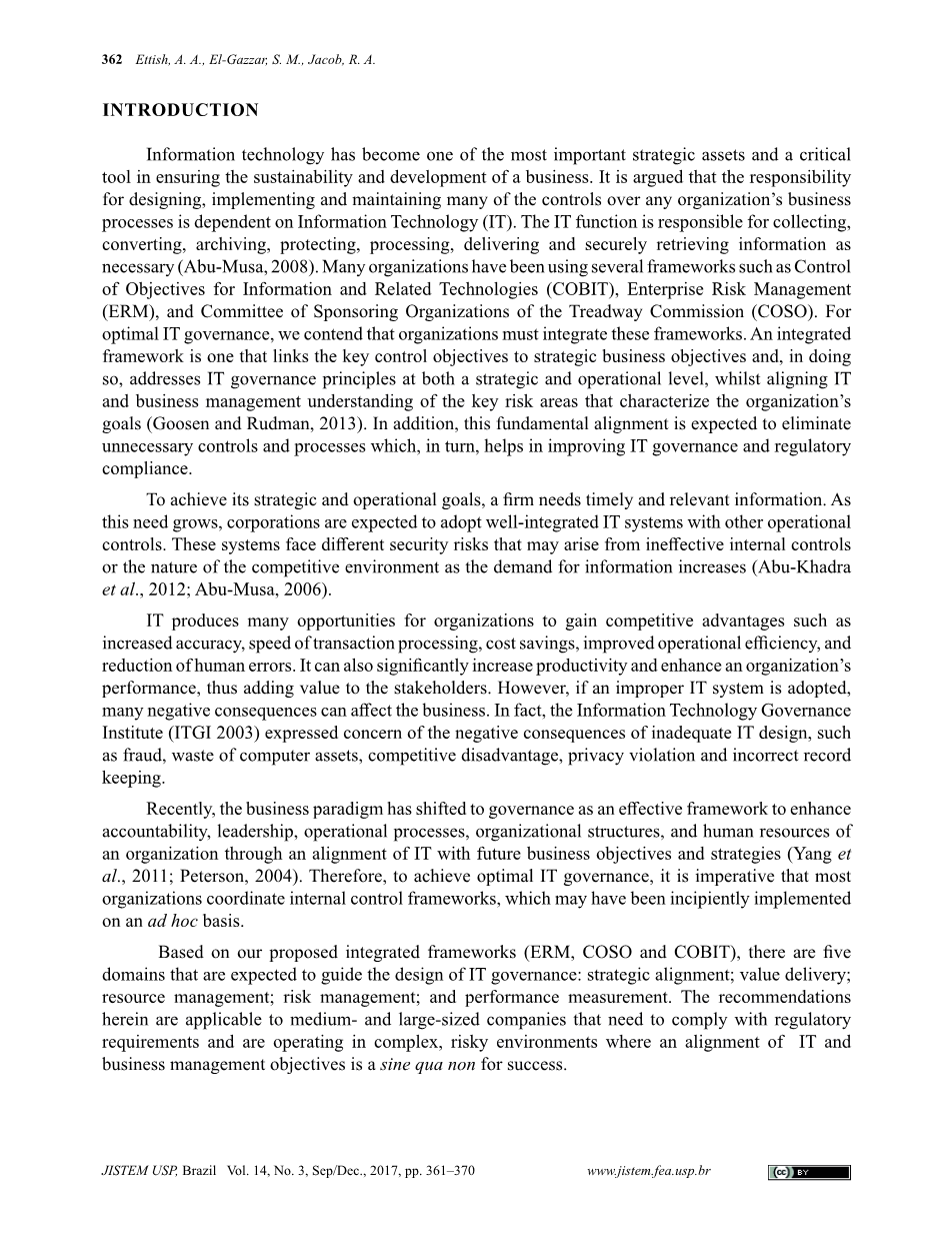 信息技术已成为确保业务可持续性和企业发展的最重要的战略资产和至关重要的工具。有人认为,设计、实施和维护等任何组织业务流程的许多控制措施的责任取决于信息技术(IT)。IT的作用包括根据需要收集、转换、归档、保护、处理、传递和安全地检索信息(Abu-Musa,2008年)。许多组织一直在使用多个框架,例如信息和相关技术的目标控制(COBIT),企业风险管理(ERM)和Treadway委员会发起的组织委员会(COSO)。集成框架是一种将关键控制目标与战略业务目标联系在一起的框架,在此过程中,可以在战略和运营层面上强调IT治理原则,同时使IT和业务管理对代表组织目标的关键风险领域的理解保持一致(Goosen和Rudman,2013年)。此外,这种基本的一致性有望消除不必要的控制和流程,从而有助于改善IT治理和服从监管。