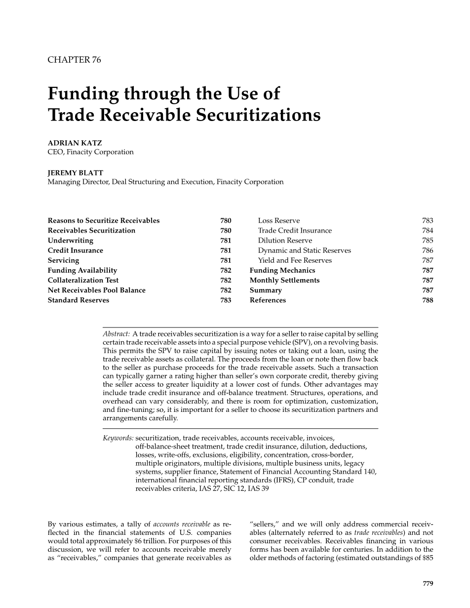 关键词:资产证券化、应收款项、应收账款、发票、资产负债表外活动、贸易信贷保险、稀释、减免、损失、冲销、排除、资格、集中度、跨境、多个发起者、多个部门、多个业务单位、供应商融资、财务会计标准声明、国际财务报告准则(IFRS)、商业票据、应收款项标准、原文如此、IAS 27、 IAS 39