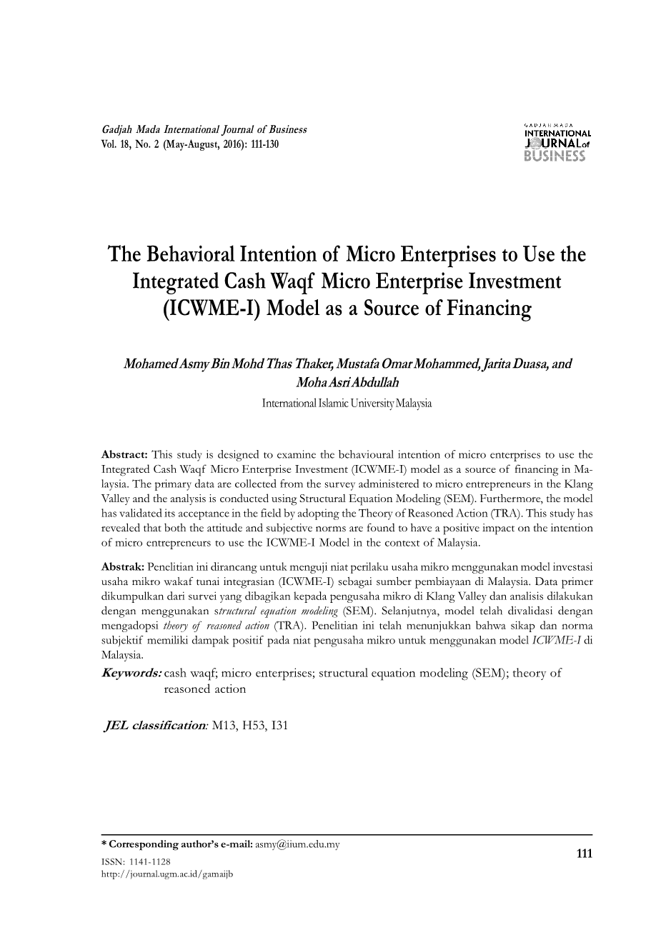 摘要:本研究旨在检验微型企业以使用集成现金Waqf微型企业投资(ICWME-I)模型作为马来西亚的融资来源的行为意图。主要数据来自对巴生谷的微型企业家进行的调查,并使用结构方程模型(SEM)进行了分析。此外,该模型通过采用“合理行动理论”(TRA)验证了其在领域的接受性。这项研究表明,态度和主观规范都对微型企业家在马来西亚背景下使用ICWME-I模型的意图产生了积极影响。