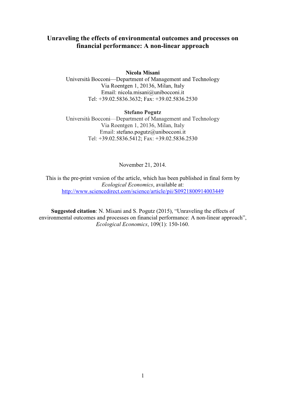 我们通过Tobinrsquo;s q这一指标,来检测环境绩效的结果和过程在财务绩效方面所起的作用。其中结果指的是公司对自然环境的影响,而流程则是指公司为了减少这些结果而采取的行动。我们关注一个特定的结果数据——碳排放,并假设它非线性地影响Tobinrsquo;s q。我们发现,当碳排放的绩效不高也不低,处于中级时,企业的财务绩效最高,同时我们也发现了,环境流程可以通过改善利益相关者管理来增强公司的财务绩效来降低这种关系。这种混杂的情况表明,虽然企业通常不会在内部将碳绩效不佳的成本内部化,但是在环境结果和流程上都做的更好的企业可以获得净财务收益。这些发现机遇碳密集型企业的样本,这些样本数据来源于2007年值2013年企业通过碳披露项目披露的其温室气体(GHG)的排放量。