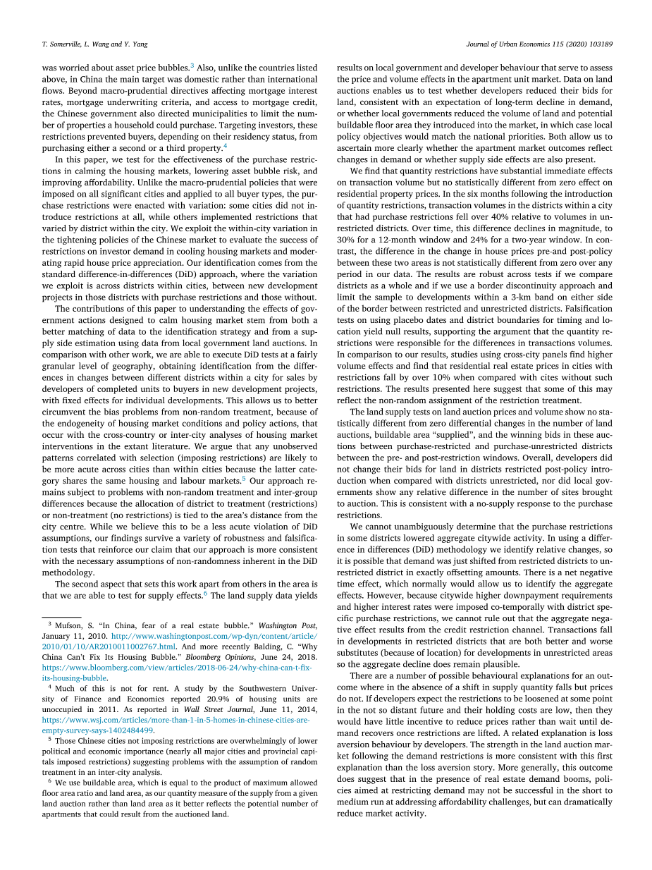 为了应对由于房价快速上涨所导致的住房支付能力不断恶化,一些政府出台了税收或限制措施,以减少非居民对本地住宅房产的需求。我们研究了2010—2011年中国地方政府对个人可购买住房数量的限制措施的有效性。在实施这些限制措施的痛时,我们利用开发商对新建筑单元的销售,并在城市差异内进行开发,以确定它们对价格和交易量的影响。除了这些对需求的直接影响外,我们还利用地方政府向开发商拍卖土地的数据,确定了这些政策对供应的影响。我们的研究结果表明,在短期内,与没有限制措施的地区相比,对非业主居住者购买的限制显著降低了其约40%的购买水平。这些影响会随着时间逐渐减弱。然而在政策出台后,限制地区和非限制低区的房价并没有相对的变化。结果是由最终用户的需求产生的,而非通过土地市场和开发商后续的供应反应产生的,因为在引入限制购买的地区与没有限制购买的地区之间,土地拍卖的数目或支付的地价并无相对改变。