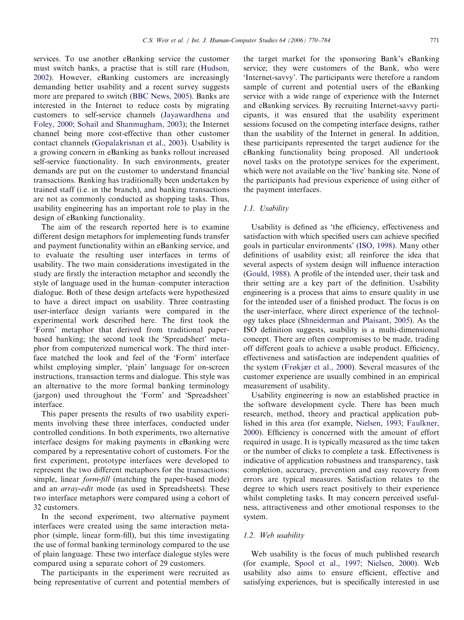 本文介绍的两个可用性实验涉及这三个接口的结果,控制的条件下进行的。在这两个实验中,两种替代的接口设计在网银支付的客户代表人群相比。对于第一个实验中,原型接口,代表了不同的隐喻的交易简单、线性的表格填充(匹配纸张模式)和一个数组编辑模式(如电子表格所使用)。这2个界面的隐喻进行了比较,使用队列的32名客户。