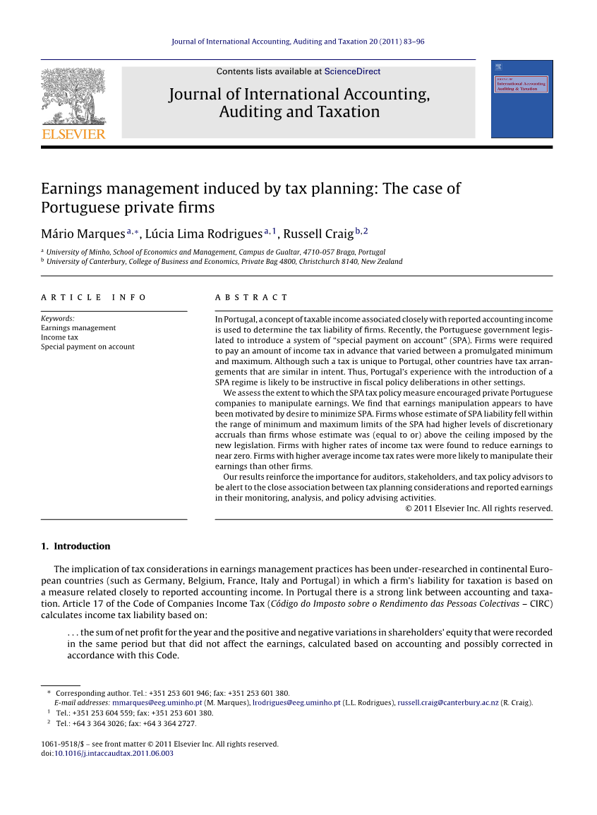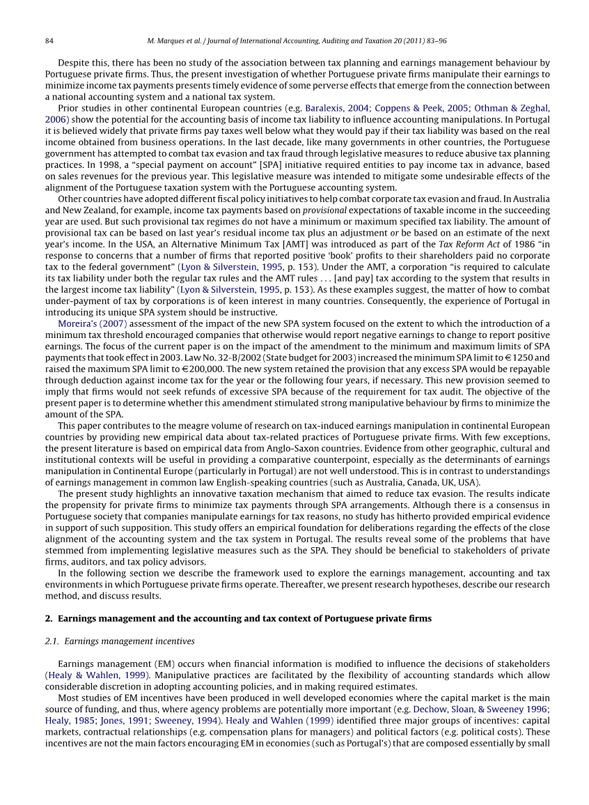 当年的净利润总额与股东权益的变化被记录在一个相同的期间但是并没有影响收入,计算基于会计或者根据准则有点改变。尽管如此,在葡萄牙的私营企业中也没有调查学习税收筹划与企业盈余管理之间的关系。之前在欧洲大陆其他国家的研究显示基于会计准则的应交税费会潜在的影响企业操纵利润。在葡萄牙,私营企业纳税远低于他们将支付如果他们的纳税义务是基于真正的生产销售收入被广泛认同。在上一个时期,像其他国家的政府一样,葡萄牙政府已经尝试利用法律手段打击逃税和税收欺诈。在1998年葡萄牙初次提出实行SPA之后,企业需要基于收入所得提前缴纳所得税。这项法律性的政策措施目的在于最大限度的消除葡萄牙税务系统与会计系统中的不好影响。