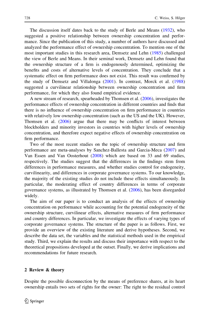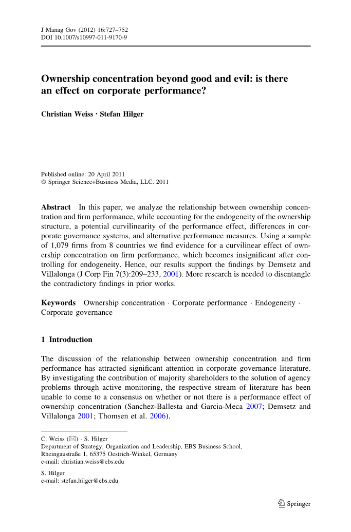 相关讨论可以追溯到Berle和Means(1932),研究提出股权集中度与绩效之间存在正相关关系。 由于该研究的出版,许多作者讨论并分析了股权集中度的表现效果。在这个研究领域最重要的研究之一,德姆塞茨和莱恩(1985)挑战Berle和Means的观点。德姆塞茨和莱恩创造性的研究发现,公司的股权结构是内生决定的,通过股权集中度水平优化成本效益。他们的结论是对公司业绩产生系统性影响是不存在的。这一结果是由德姆塞茨和比利亚隆加(2001)的研究证实。与此相反,莫克等(1988年)提出股权集中度与企业绩效之间呈曲线关系,为此,他们也发现了经验证据。