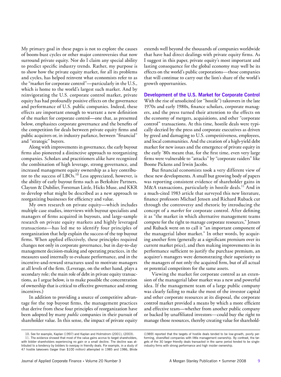 没有低估上面提出的问题的重要性,但我想暂且将它们放在一边,直到本文的结尾。我在这些章节里的主要目标不是去探索繁荣 - 萧条周期的原因或如今围绕私募股权投资其他重大争议。我也不声称具有预测某一特定的行业发展趋势的特殊能力。相反,我的目的是展示私募股权市场,包括其所有的问题和周期,如何是帮助重塑了经济学家所称的“公司控制权市场”——特别是在世界上最大的此类市场的美国。并通过重振美国公司控制权市场,私募基金已经对美国上市公司的治理和业绩产生了深刻的积极影响。事实上,这些影响是重要的,足以保证了确定一个公司控制权市场的新定义——强调公司治理和竞争的私募股权投资公司和公共收购者之间的利益,用行业用语来说,即“金融”和“战略”的买家之间的利益。