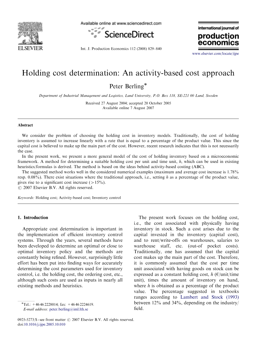 本工作的重点是持有成本,即与库存的库存在库存的成本。这种成本的产生是由于资本投资于存货(资本成本),并在仓库,工资,仓库工作人员等(从口袋成本)的租金/核销。传统上,一个假定资本成本构成了成本的主要部分。因此,通常假定,与库存货物相关联的每一时间单位的成本可以表示为一个固定的成本,小时/单位/时间单位),时间的库存量的手,在那里获得的产品价值的百分比。根据不同的行业/领域,比例建议在教科书范围根据Lambert和股票(1993)12%和34%之间。