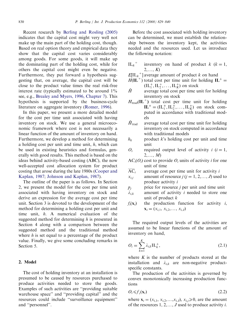 在本文中,我们提出了一个更详细的模型的成本每单位与库存相关的库存。我们使用一个通用的框架,微观经济成本不一定是库存量的线性函数。此外,我们开发了一个用于确定单位持有成本和时间单位,H的方法,可用于现有的算法和公式,一般有好的结果。这种方法是基于作业成本法(ABC)背后的想法,现在公认为产品成本出现在20世纪80年代末的成本分配系统(库珀和卡普兰,1987;约翰逊和卡普兰,1987)。