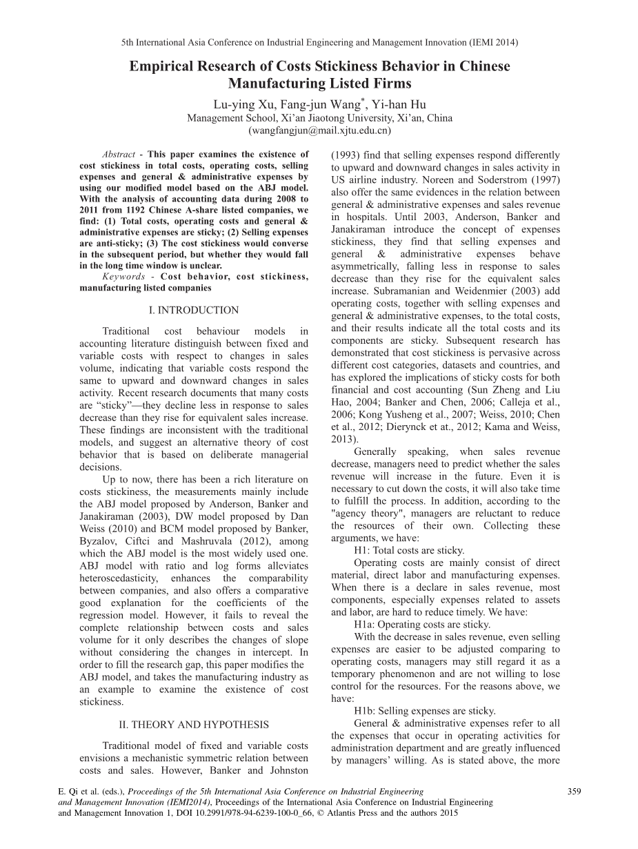 [3] Banker, R, D., Byzalov, D., and Ciftci, M., et al. 'Themoderating effect of prior sales changes on asymmetriccost behavior', Working paper, 2012.