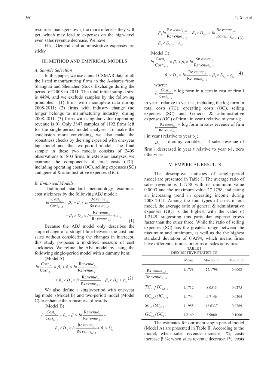 本文采用2008年至2011年期间,上海和深圳证券交易所A股上市制造企业的年度CSMAR数据,初始样本总数为4494个,按照以下原则排除样本:(1)企业 2008-2011年数据不完整; (2)2008 - 2011年度行业变化的企业(不再属于制造业)。 (3)具有奇特数值的公司(营业收入为0)。只剩下3847个样本的1192家公司为单一阶段模型分析。为了使这一结论更有说服力,我们也用单年期模型和两期模型进行单期检验。 这两个模型的最终样本包括803个公司的2409个观察结果。 在延期分析中,对总成本(TC)的组成部分进行检验,包括运营成本(OC),销售费用(SC)和管理费用(GC)
