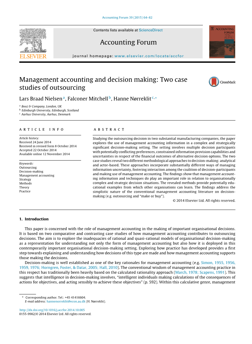 本文的研究目的就是解决上述问题,因此本文会采用归纳法。本文利用两家案例公司大量数据建立模型,描述决策者团体如何分析复杂问题以及怎样利用管理会计信息做出外包决策。所以归纳模型的功能是确定管理会计在支持决策方面起到的种种作用,而非在预测决策行为和决策后果方面的作用。本文揭示了两种决策制定方法,两种方法处理可选方案信息不确定性的方式和决策参与者间的互动方式有着本质的区别。这些关于方法论的研究发展了管理会计决策制定的理论,超越了传统的微观经济学模型和组织理论。本文将外包决策置于战略背景中考虑。