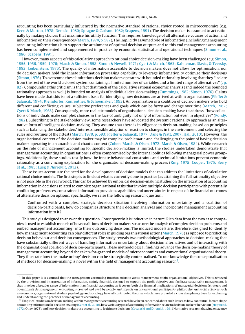 但是基于准确计算做出理性决策的理论存在许多局限性。比如,决策者不一定能获取有助于做出最优决策的高质量信息,也不一定具备天生的信息处理能力,能够利用信息使其决策达到最优化。为了克服这些局限性,假设决策者拥有有限理性,并假设他们存在于一个与外界孤立、仅包含有限个变量和备选方案的封闭系统内。除此之外,基于计算的理性经济分析(实际上有限理性也是)大多局限于对个体的分析,这一点也受到质疑。有学者认为基于计算的理性决策理论无法有效解释组织制定决策的机制。任何一个组织都存在一个决策团体,团体中的个人拥有不同的价值观、主观偏好和含混且随时间变化的目标。一些支持利益相关者理论的学者认为,系统理性方法是明智决策的另一种形式。他们假定明智的决策平衡了利益相关者的利益,能适应环境的变化,并且制定最恰当的规则。目前对管理会计在制定特定决策中的作用研究尚不足,一些正在进行的研究表明,组织内部的高管集团主导着决策制定过程,他们的意志凌驾于管理会计信息之上。除此之外,这些研究还测试固有行为限制和技术限制如何破坏经济理性,据以准确解释组织中决策的制定过程。