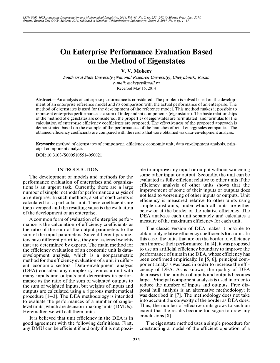 企业绩效评估的一种常见形式是将效率系数计算为输出参数之和与之比输入参数的总和。由于不同的参数具有不同的优先级,因此它们被分配由专家确定的权重。经济单位效率评估的主要方法是数据包络分析,这是一种不同经济部门单位效率评估的非参数方法。数据包络分析(DEA)将任何复杂系统视为具有许多输入和输出的单元,并将其性能确定为加权输出总和与加权输入之和的比率,但输入和输出的权重使用严格计算数学的程序[1-3]。DEA方法旨在评估许多单级单位的绩效,这些单级单位是决策单位(DMUs)。在下文中,我们将其称为单位。