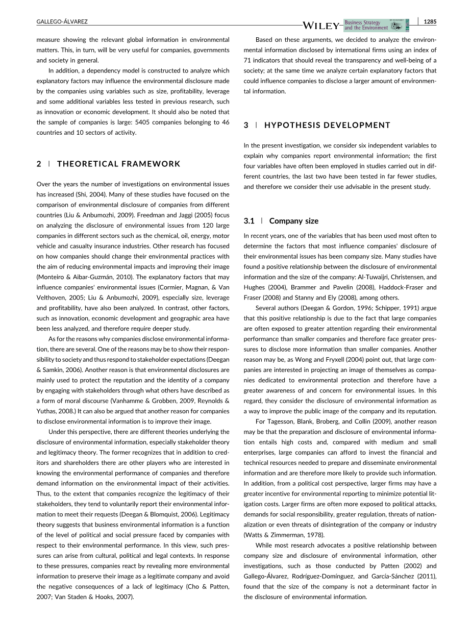 近年来,最常用于确定影响公司披露其环境问题的因素的变量之一是公司规模。 许多研究都有发现环境信息披露与公司规模之间存在正相关关系。Al-Tuwaijri,Christensen和Hughes(2004),Brammer和Pavelin(2008),Haddock-Fraser和Fraser(2008)和Stanny and Ely(2008)等。