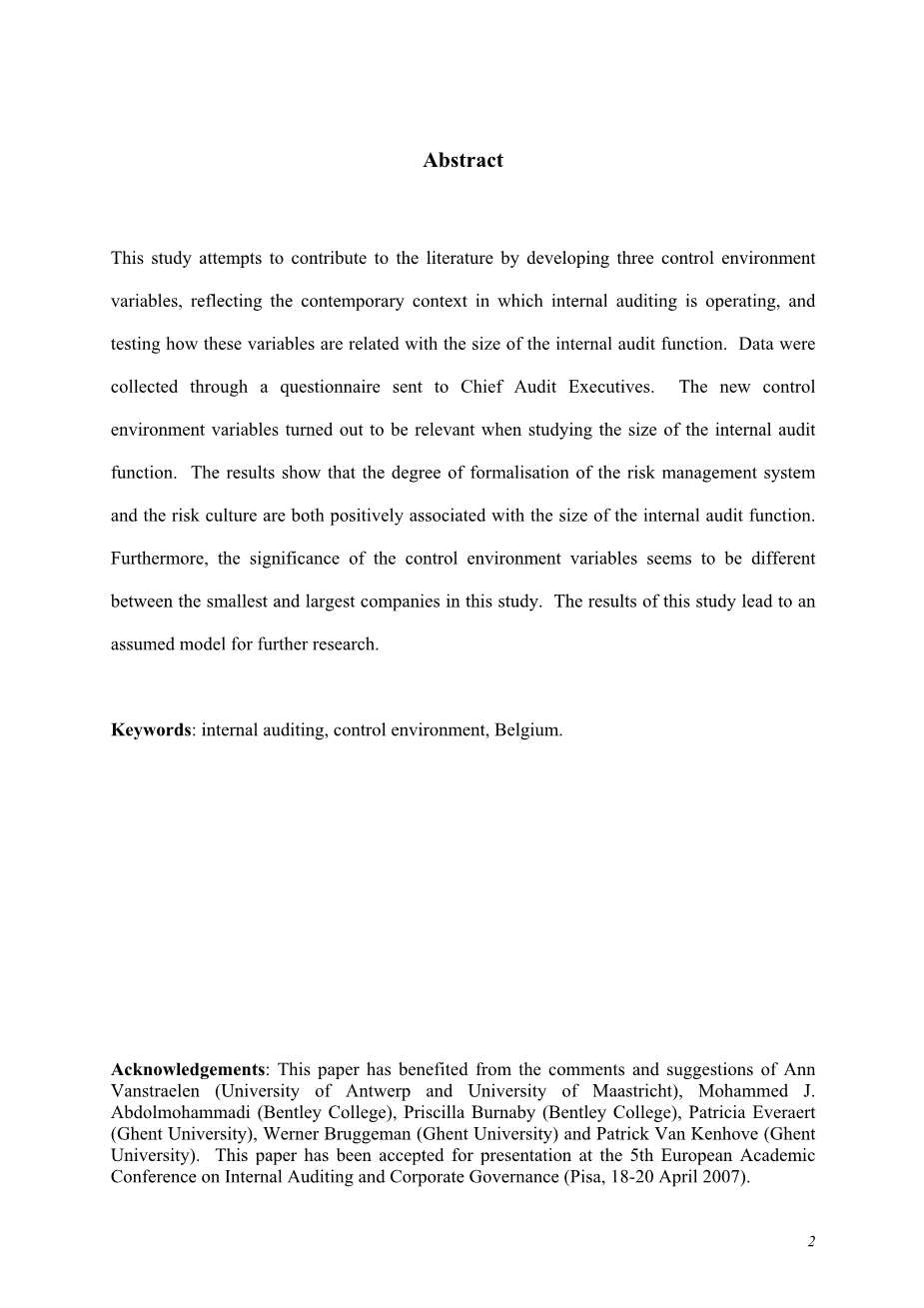 关键词:内部审计,控制环境,比利时