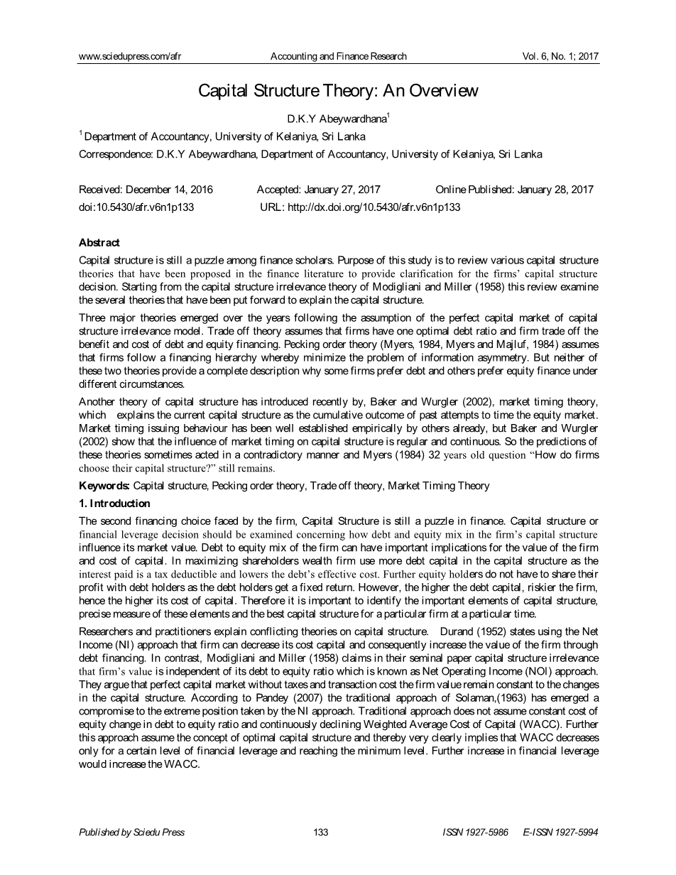 斯里兰卡Kelaniya大学会计系, 通信:斯里兰卡Kelaniya大学会计系的D.K.Y Abeywardhana, 网址:http://dx.doi.org/10.5430/afr.v6n1p133