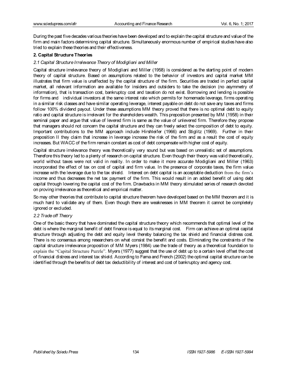 在过去的五十年中,各种理论得到发展,并解释了企业的资本结构和价值以及决定资本结构的主要因素。同时,大量的实证研究也试图解释这些理论及其有效性。