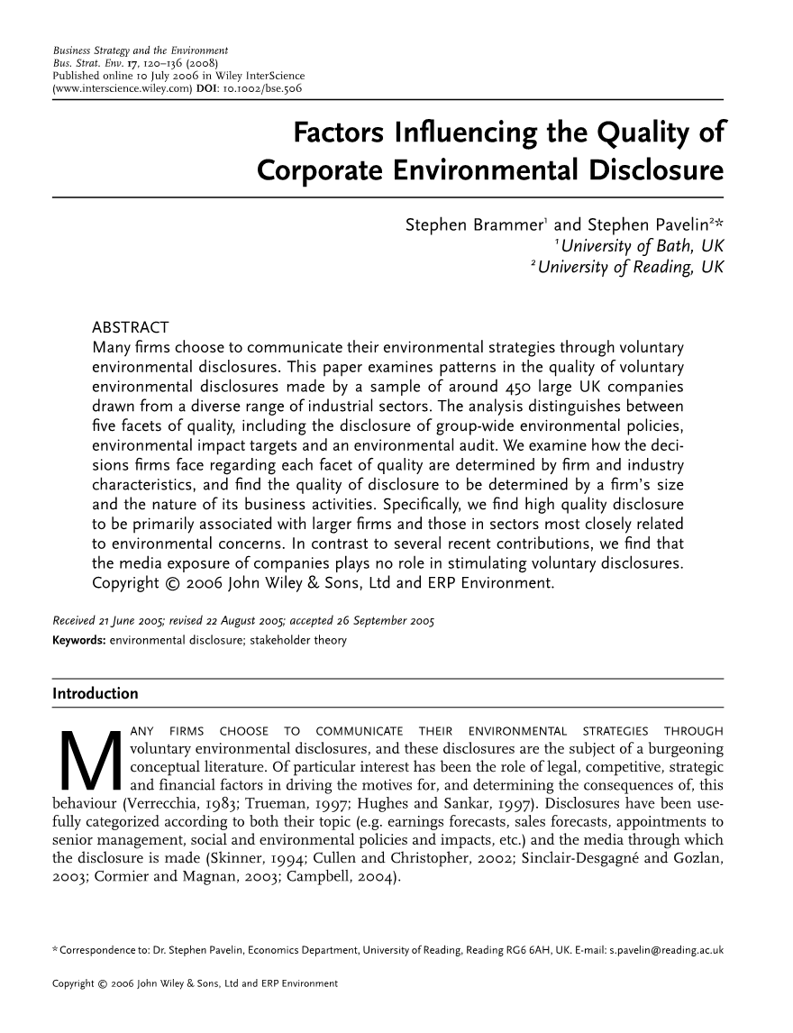 本文考察了447家英国企业所披露的环境信息质量的差异。本文的研究有三个实质性的贡献。第一,我们将环境信息的披露质量从环境政策、具体的环保行为、对环境造成的定量影响、设立的环保目标和是否经过外部审计五个层面进行量化。然后我们分别分析这五个层面的披露率,从而避免了早期研究中存在的对所有不同类别进行简单加总的做法,并可以从五个不同的层面分析其分别受到的各因素的影响。第二,本文选取的样本比以前采用的样本量更大,选取的行业也更多样化,这样可以比以前的研究更加全面地探索企业和行业特征对企业环境信息披露的影响。第三,我们采用了多元逻辑回归模型,以更好地与因变量相匹配。从多元回归分析的结果中可以看出企业环境信息披露的质量取决于公司的规模和其经营活动的性质,即高质量的环境信息披露主要存在于大规模的企业以及那些关注环境问题的行业的企业中。此外,与近期研究结论相反,我们发现媒体曝光对企业环境信息的自愿披露没有任何作用。