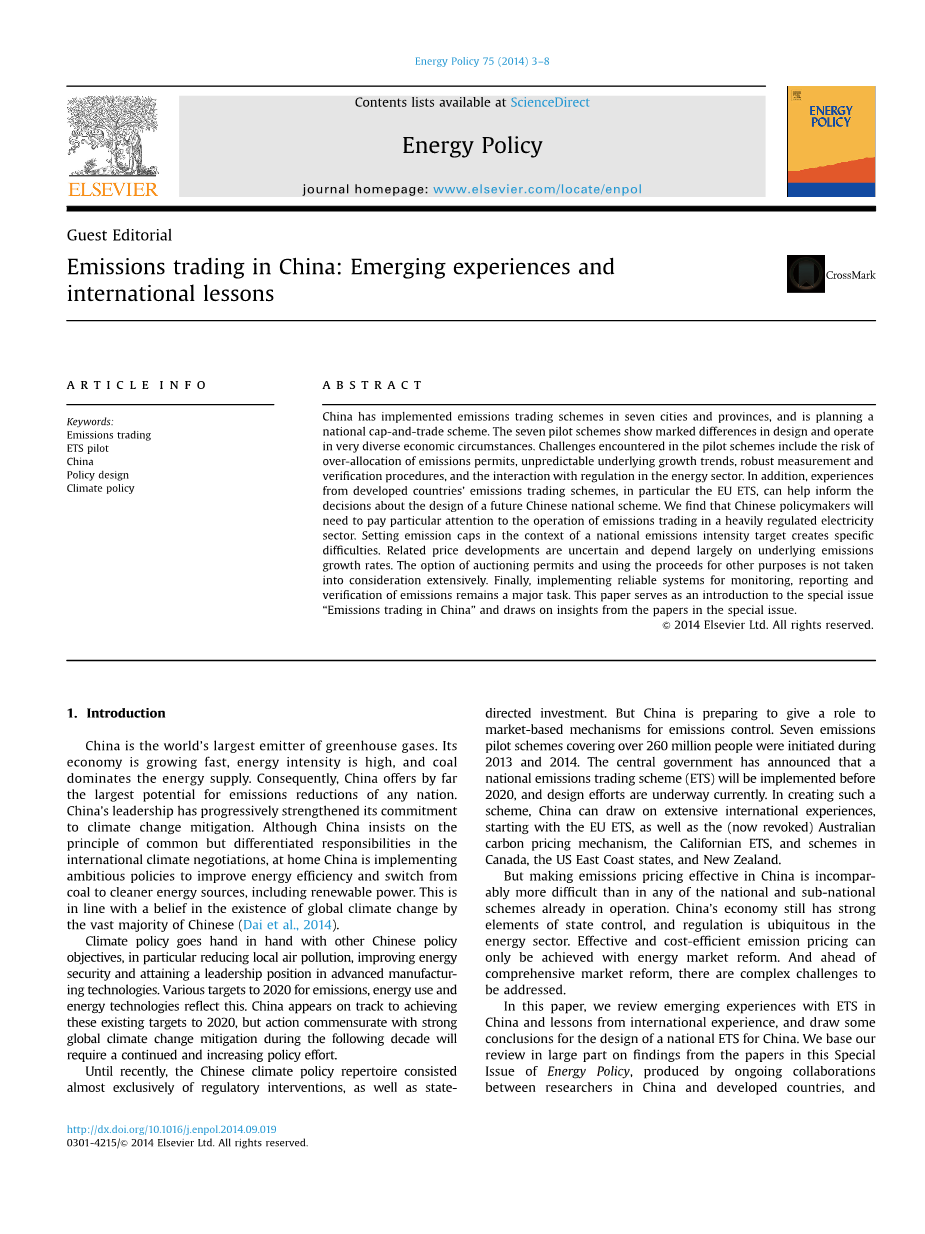 在本文中,我们回顾了排放交易体系(排放交易体系)的新兴经验中国和国际经验教训,并画出一些为中国设计国家排放交易体系的结论大部分的研究结果都来自于特别的发布能源政策,12月21日在曼海姆宁,欧洲经济中心研究(ZEW)演示中国和发达国家之间的研究人员。