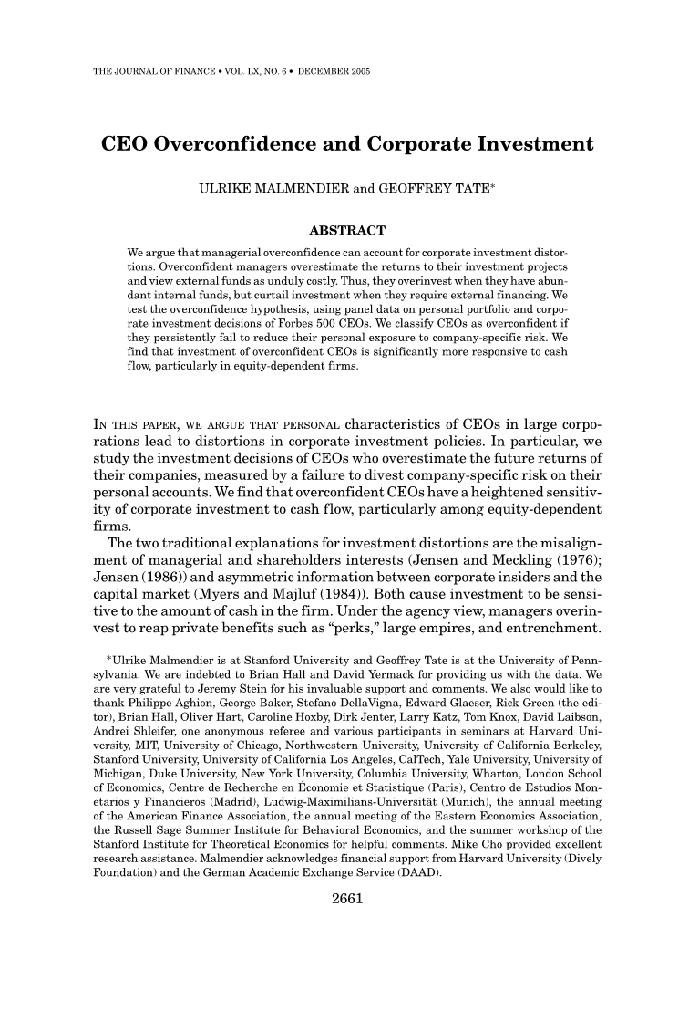 在本文中,我们认为,在大公司的首席执行官personal.characteristics导致企业投资政策的扭曲。特别是,我们研究的首席执行官们高估了他们公司的未来回报的投资决策,通过破坏剥离公司特定风险对其个人账户进行。我们发现,过度自信的首席执行官有一个提高灵敏度的企业投资的现金流,特别是在股权相关的公司