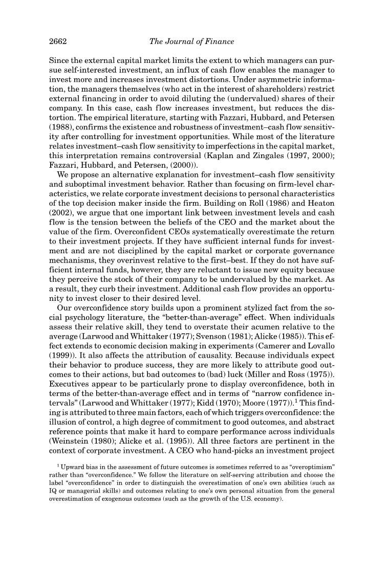 我们提出了另一种解释投资的现金,低灵敏度和次优的投资行为。而不是专注于企业级特性的特点,我们与企业投资决策的最高决策者在公司内部的个人特征。建筑对辊(1986)和希顿(2002),我们认为,投资水平和现金流之间的一个重要环节是CEO的信念和对公司价值的市场之间的张力。过度自信CEO经常回到他们的投资项目。如果他们有足够的资金用于投资发展和不被资本市场和公司治理机制的纪律,他们过度投资相对于第一最好。如果他们没有足够多的资金,但是,他们都不愿意发行新股票是因为他们认为他们公司的股票被低估的市场。结果,他们控制了投资。额外的现金低提供了一个机会时投资接近理想水平。