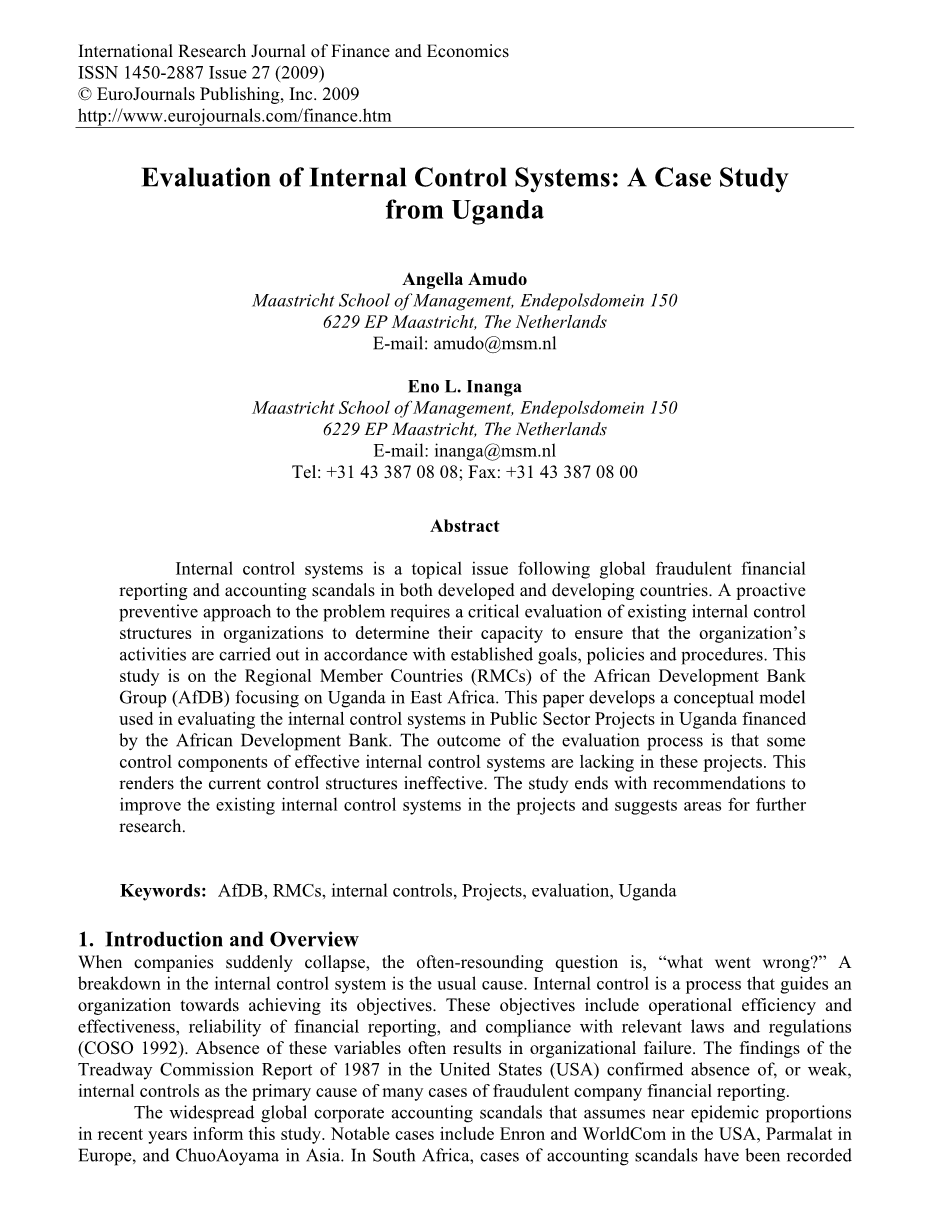 摘要:纵观全世界,全球性的金融欺诈案和会计丑闻频发,无论是发展中国家还是发达国家都不能幸免。在这样的背景下,内部控制成为热门话题。我们需要积极的预防内部控制出现问题,现有的方法就是对内部控制体系组织结构进行批判性的评估,以确保该组织的按照既定的目标、政策和程序进行活动。本文研究的对象是非洲东部的乌干达市的由非洲发展银行主持进行的公共项目。笔者建立了一个概念模型用于评估乌干达市由非洲发展银行投资的公共设施内部控制系统。评估的结果是这些项目内控控制系统不完善,内部控制没有达到既定目标。最后,笔者提出了关于改进内部控制体系的建议,并认为这一领域仍有待进一步研究。