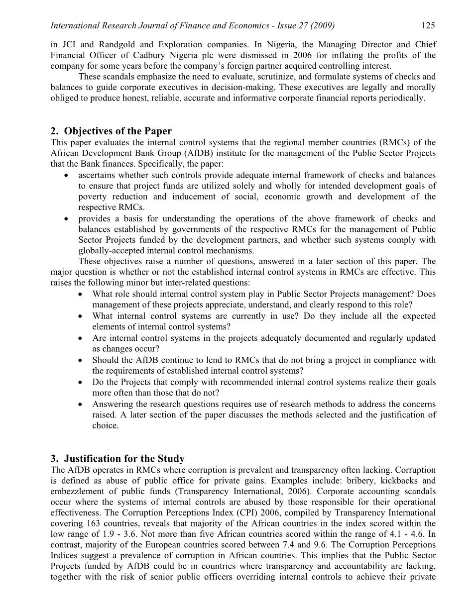 这篇(论文)分析了当地地区成员国的非洲建设银行的内部管理系统,对于公共工程项目的资金管理。具体而言,这篇文章是为了检验项目内部是否有完整的内部控制框架来稽核与平衡项目资金仅用于原定的对当地地区成员国减少贫困与增加社会与经济发展的目标。为上述各区域会员国政府对开发伙伴出资的公共工程所建构的制衡框架,提供了具体执行上的理论基础,此种制度是否遵守全球通用的内部稽核机制。对于这些目标引起的诸多问题,将在本文后面部分进行解答。其中,主要问题是地区成员国是否制定了有效的内部控制体系,对此,引出以下细微但相互间存在必然联系的各种问题:内部控制系统在公共工程项目管理里发挥着什么样的作用?这些项目的管理方是否能意识它的重要性,了解它的控制目标,并确切配合它的功能呢?现在实施的内部控制系统是什么样子的,它是否包含所有预期的内部控制系统要素?内部控制系统是否有完整的记录,是否会随着项目的变化而不断改进?非洲发展银行是否应该继续贷款给区域成员国中那些没有建立内部控制制 度的公共工程项目?符合推荐的建议的内控体系的项目比不符合建议的内控体系的项目实现目标的机会更多么?我们需要对选择一些方法对这些问题进行研究,在后面会讨论选择的方法和选择这些方法的理由。