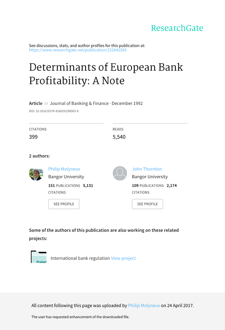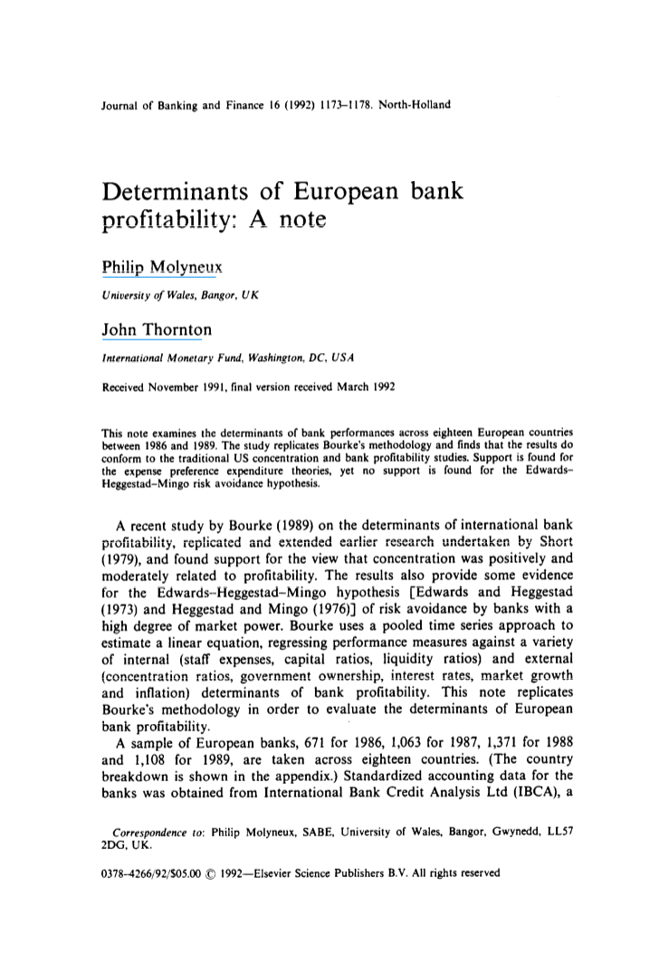 最近,Bourke(1989)对国际银行盈利能力的决定因素进行研究,参考了Short(1979)早期的研究,找到了一些支持银行资产集中率和盈利能力相关的依据,他的研究结果也支持“Edwards-Heggestad-Mingo假说”{Edwards and Heggestad(1973)和Heggestad和Mingo(1976)},那就是银行可以通过市场才避免风险。Bourke选用连续时间序列数据,然后估计一个线性方程,自变量包括银行内部的绩效指标,例如员工费用、资本比率、流动性比率,自变量还包括银行外部的与盈利能力有关的其他因素,例如资产集中率、政府所有权、利率、市场增长和通货膨胀等。本文重复Bourke的方法论,来评估欧洲的决定因素银行盈利能力。