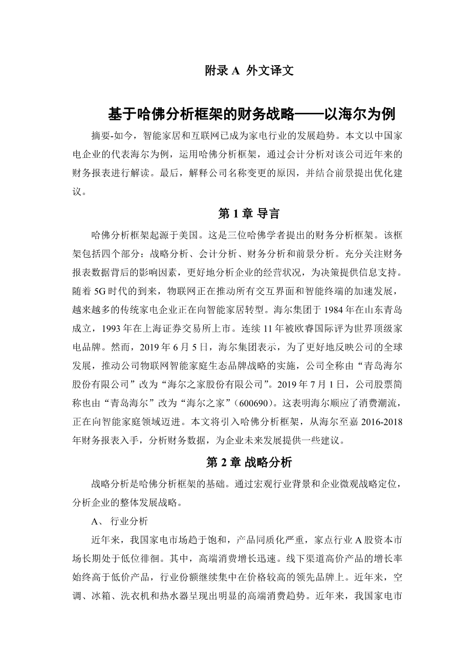 The Harvard analytical framework originated in the United States. It is a financial analytical framework proposed by three Harvard scholars. The framework includes four parts: strategic analysis, accounting analysis, financial analysis and prospect analysis. It fully pays attention to the influencing factors behind the financial statement data, and better analyzes the operating status of the enterprise, so as to provide information support for decision-making. With the advent of 5G era, the Internet of things is driving the accelerated development of all interactive interfaces and intelligent terminals, and more and more traditional home appliance enterprises are transforming into smart homes. Haier group was founded in 1984 in Qingdao, Shandong Province, and listed on the Shanghai stock exchange in 1993. It has been ranked the worlds top household appliance brand by euro monitor international for 11 consecutive years. However, on June 5, 2019, Haier group said that in order to better reflect the companys global development and promote the implementation of the companys IoT smart family ecological brand strategy, the full name of the company was changed from 'Qingdao Haier Co., LTD' to 'Haier Zhijia Co., LTD'. The companys stock abbreviation also changed from “Qingdao Haier” to “Haier Zhijia” (600690) on July 1, 2019.This indicates that Haier complies with the consumer trend and is marching into the field of intelligent family. This paper will introduce the Harvard Analysis Framework, start from the financial statements of Haier Zhijia from 2016 to 2018, analyze financia data, and provide some suggestions for the future development of the enterprise.