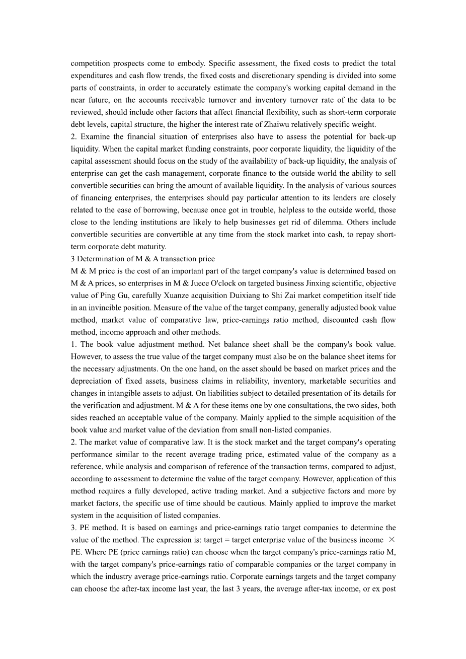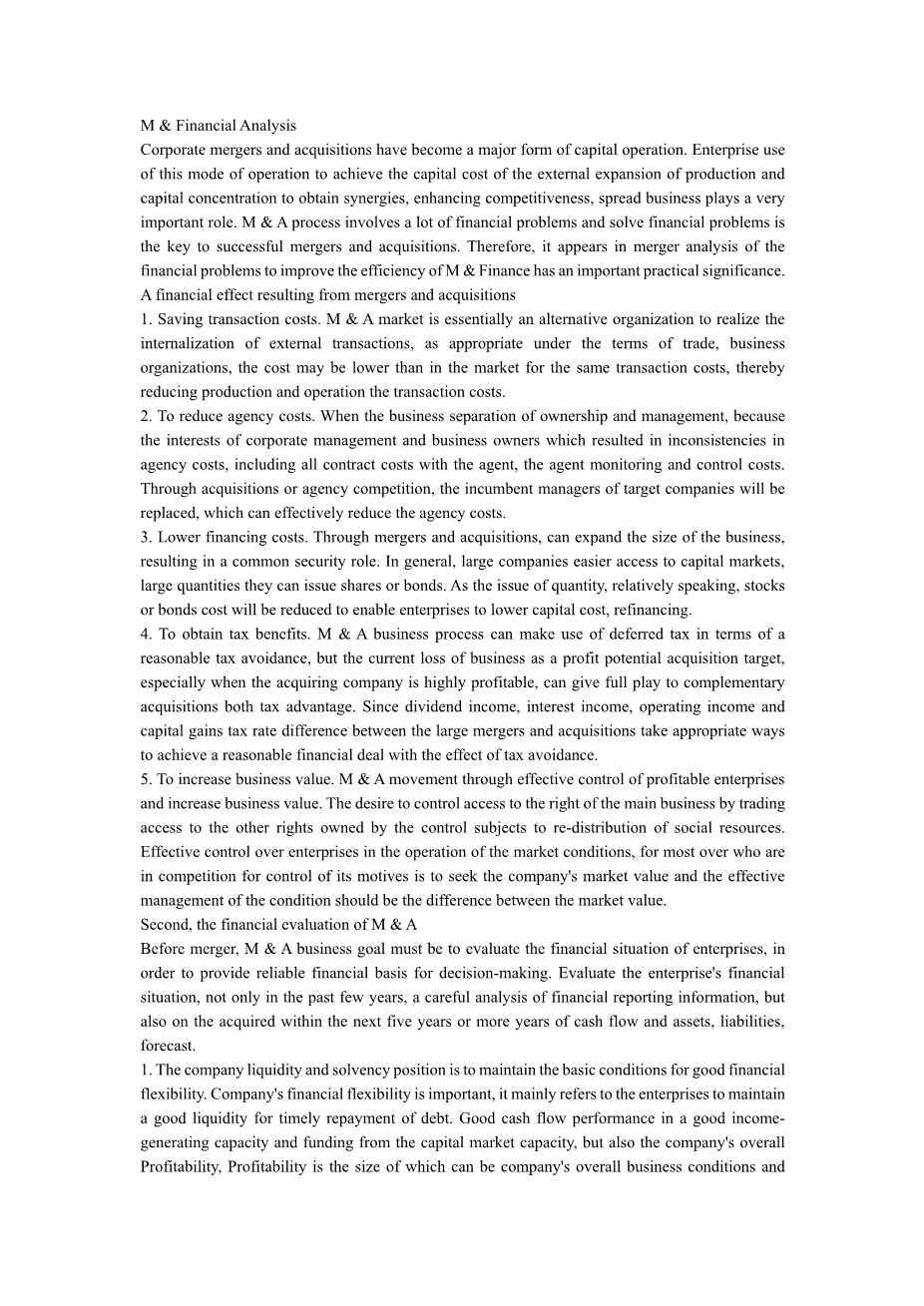Corporate mergers and acquisitions have become a major form of capital operation. Enterprise use of this mode of operation to achieve the capital cost of the external expansion of production and capital concentration to obtain synergies, enhancing competitiveness, spread business plays a very important role. M amp; A process involves a lot of financial problems and solve financial problems is the key to successful mergers and acquisitions. Therefore, it appears in merger analysis of the financial problems to improve the efficiency of M amp; Finance has an important practical significance.