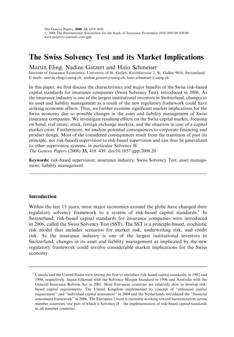 在本文中,我们首先介绍了SST的主要特点,并简要比较了SST方法与其他监管制度,如美国基于风险的资本标准或欧盟的Solvency II框架。第二,基于Schmeiser等人(2006)的研究,我们研究了SST因资产和负债管理变更而产生的主要经济影响。我们关注对瑞士资本市场的影响,包括债券、房地产、股票、外汇市场,以及资本市场危机时的情况。此外,我们还研究了对企业融资和产品设计的潜在影响。这些影响可以推广到监管的其他表现形式,因为它们主要是由向基于风险的监管过渡引起的。这一点对于欧盟(eu)计划的Solvency II条例尤为重要。