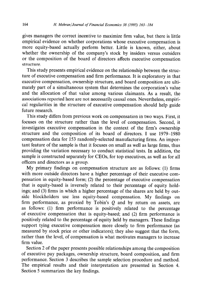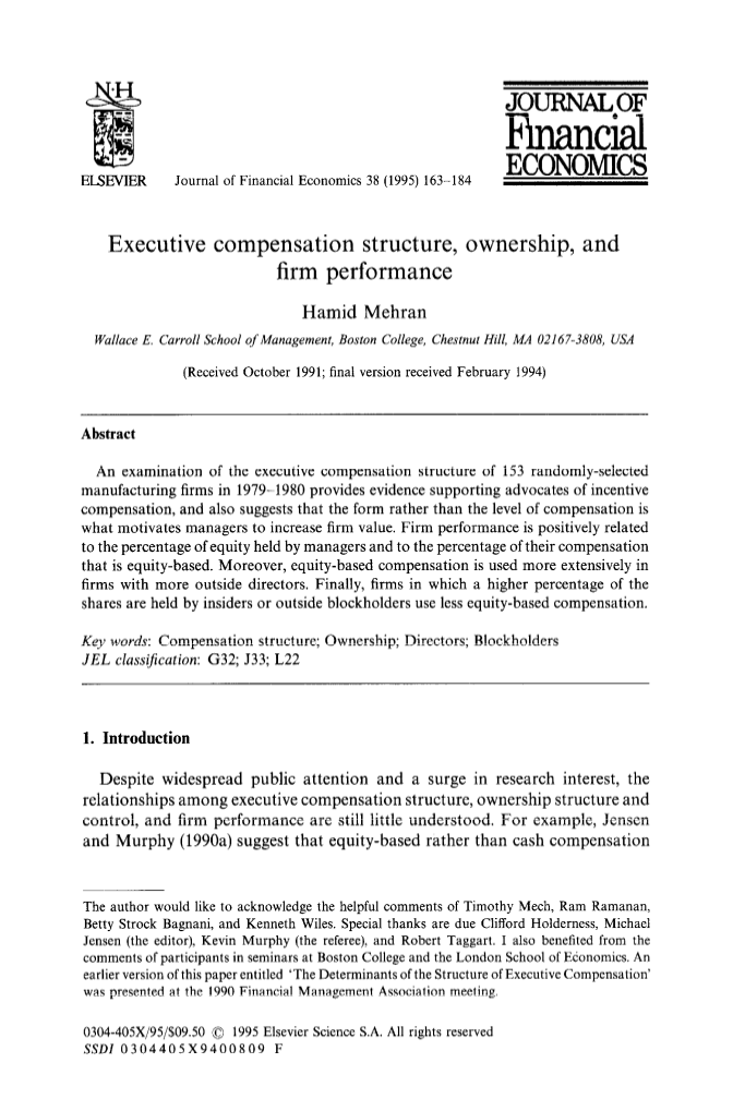 本文对1979-1980 年随机挑选的153 家制造公司的高管薪酬结构进行审查,提供了支持激励薪酬倡导者的证据,这也表明是薪酬的形式而不是水平激励了管理者提高了公司的价值。公司业绩与管理人员持有的股权百分比和基于股权的薪酬百分比呈正相关。 此外,股权薪酬在外部董事较多的公司中得到了更广泛的应用。 最后,持股比例较高的公司由内部人士或外部股东持有,并且很少使用基于股权的补偿。