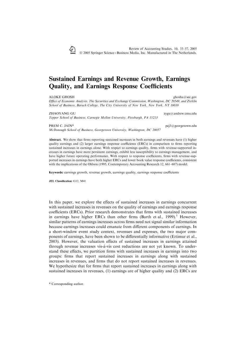 在这篇论文中,我们探讨了在收入持续增长的同时,收益持续增长对收益质量和收益反应系数(ERCs)的影响。先前的研究表明,收益持续增长的公司比其他公司具有更高的ERCs(Barthetal.,1999)。然而,公司间类似的收益增长模式并不需要传递类似的信息,因为收益增长可能来自不同的收益组成部分。在短窗口事件研究的背景下,收入和费用这两个主要的收入组成部分被证明是不同的信息(Ertimuretal.,2003)。然而,通过增加收入而实现的持续收益增长相对于成本下降的估值效应尚不清楚。为了理解这些影响,我们将收益持续增长的公司分为两类:收益持续增长和收入持续增长的公司,以及收入没有持续增长的公司。我们假设,对于那些报告收益持续增长同时收入持续增长的公司,(1)收益质量更高,(2)伦理委员会更高。与那些收益持续增长但收入没有增长的公司相比,这个数字要大得多。