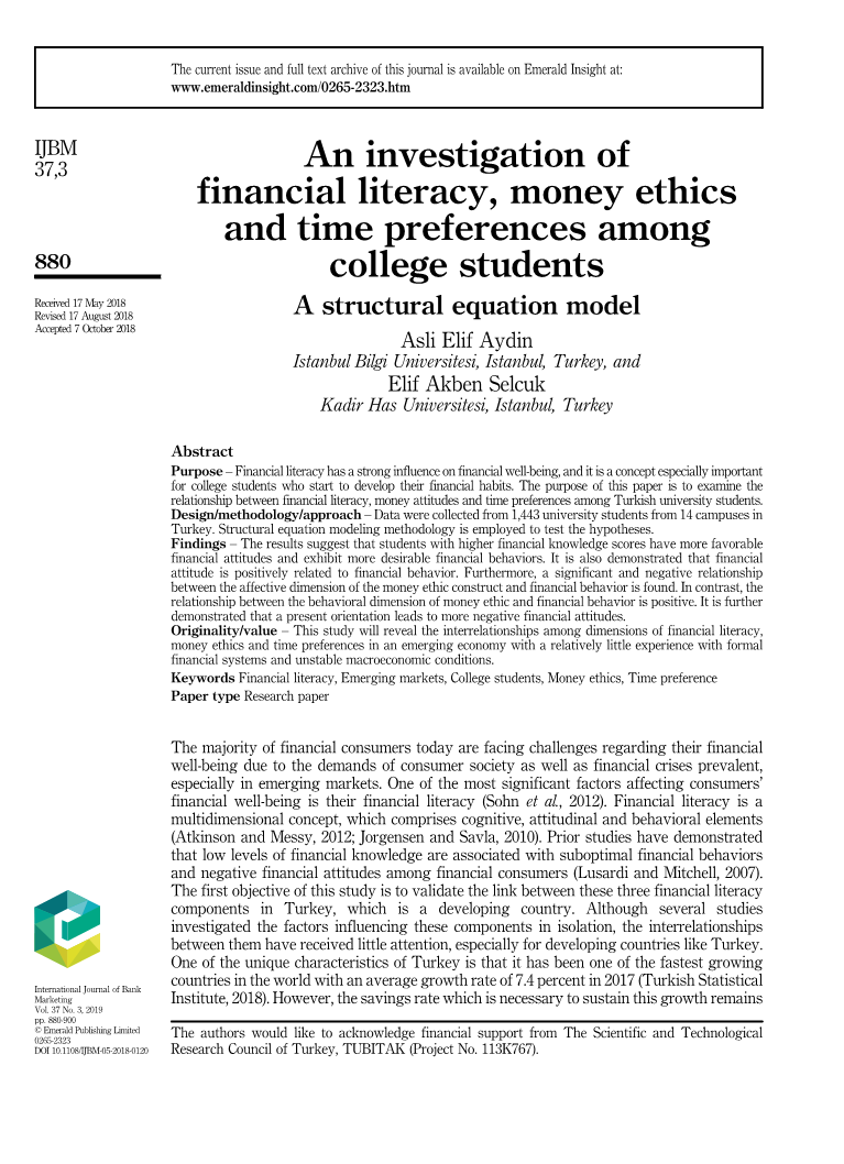 目的——金融文学对金融福祉有很强的影响,对于开始养成金融习惯的大学生来说,这是一个特别重要的概念。这篇论文的目的是检验students.Design/methodology/approach–Data土耳其大学的金融知识、货币观念和时间参照之间的关系,该研究是从土耳其14个校区的1443名大学生中收集的。采用结构方程建模方法对模型进行检验。调查结果——结果表明,金融知识得分较高的学生有更好的金融态度,表现出更理想的金融行为。财务态度与财务行为正相关。此外,在有效的血液伦理学结构和财务行为之间发现了显著的负相关关系。相反,the behavior dimension of money ethical financial behavior之间的关系是正的。它进一步证明了当前的取向会导致更多负面的金融研究。