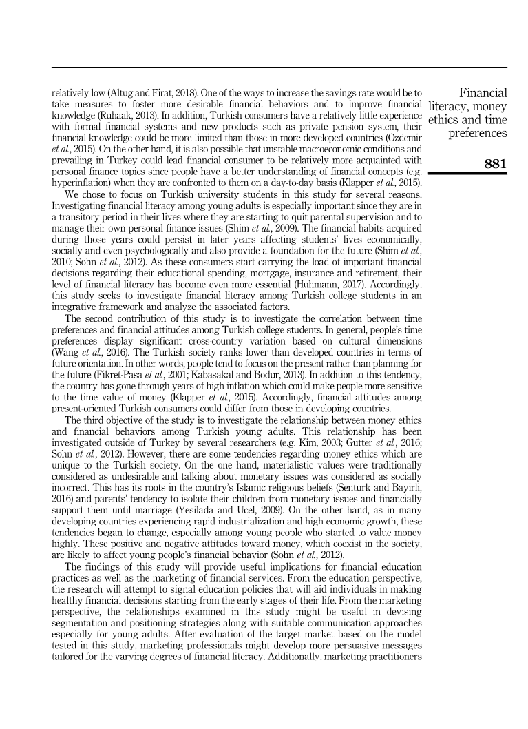 个人理财话题人们对理财概念有了更好的理解(例如超通货膨胀)时,他们是每天的基础(Klapperetal。,2015年)。在本研究中,我们选择了土耳其大学生作为研究对象,为期数年。调查财务状况调查财务状况调查财务状况调查财务状况调查财务状况调查财务状况调查财务状况调查财务状况调查财务状况调查财务状况调查财务状况调查财务状况调查财务状况调查财务状况调查财务状况调查财务状况调查财务状况调查财务状况调查财务状况调查财务状况调查财务状况调查财务状况调查财务状况调查财务状况调查财务状况调查财务状况调查财务状况调查财务状况调查财务状况调查财务状况调查财务状况调查财务状况调查财务状况调查财务,2009年)。那些年所要求的财务习惯可能会持续到以后的几年,影响学生的经济生活、社会生活甚至心理生活,并为未来打下基础。,2010年;Sohnet al .,2012)。随着这些消费者开始承担起与教育支出、抵押贷款、保险和养老相关的重要金融决策,他们的金融知识水平变得更加重要(Huhmann,2017)。相应地,本研究调查了金融学院学生