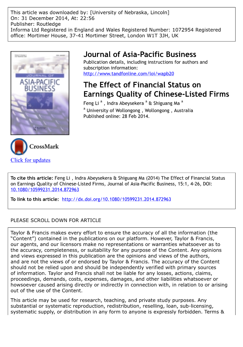 根据Altman(2006)的Z分数,基于公司资产负债表的强度,健康的公司可能比破产的公司有更高的盈利质量,因此这些公司的类别是显著不同的,因为基于会计的信息强度在决定盈利方面更为重要质量属性(Barkeramp;Imam,2008)。四个会计盈余属性的选择是cho-sen,因为每个属性都反映了不同的盈余质量维度。应计质量是一种衡量基金成本(债务和权益)的指标;收益持续性是指一个报告期到另一个报告期的收益重现或维持情况;收益可预测性是指收益预测的准确性,这是一个值得注意的方面对于标准制定者、分析师和公司估值(例如,对于合并和收购);收益平滑度告知管理者在多大程度上贡献了其私人持有的公司信息以报告更有用的收益数字(Francis等人,2004)。接下来将概述每个收益属性。