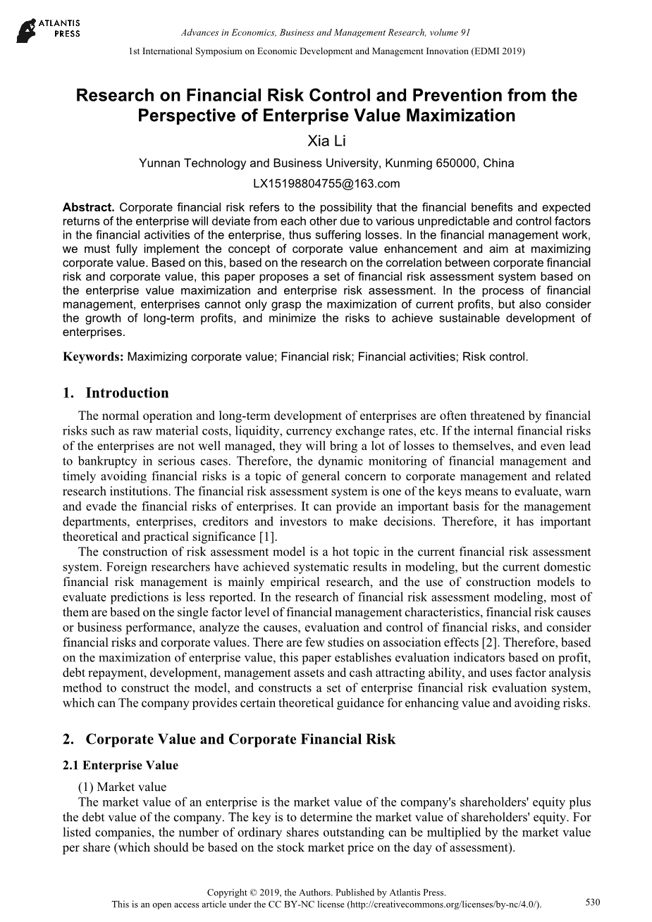Li X. Research on Financial Risk Control and Prevention from the Perspective of Enterprise Value Maximization[C]//1st International Symposium on Economic Development and Management Innovation (EDMI 2019). Atlantis Press, 2019.