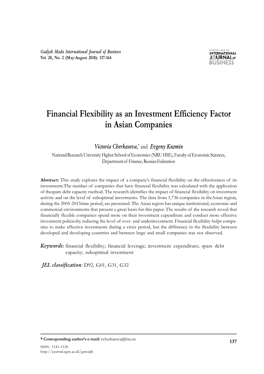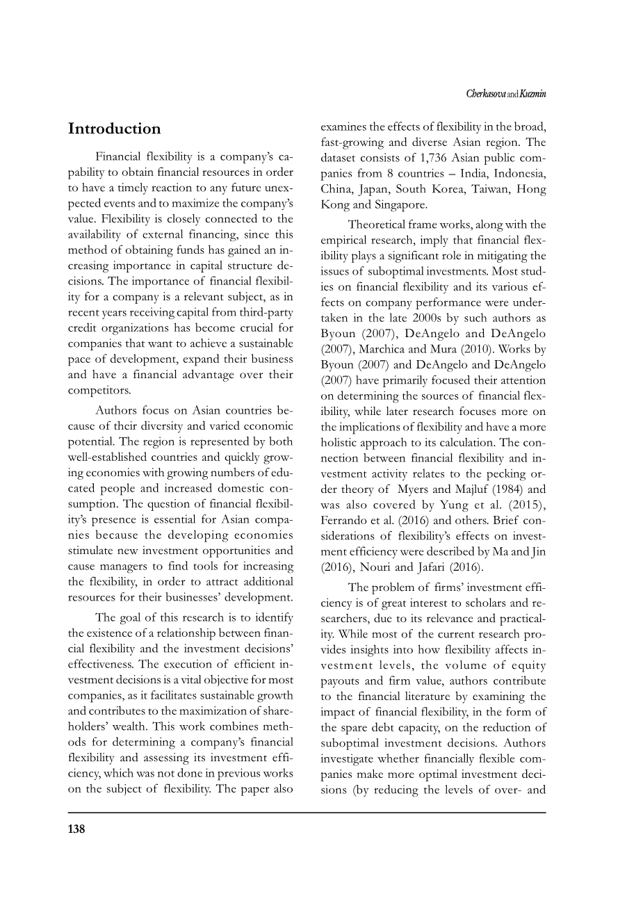 是公司获取财务资源的能力,以便及时应对任何未来的意外事件并最大化公司的价值。与外部融资的可用性密切相关,因为这种获取资金的方法在资本结构决策中的重要性日益增加,所以公司的重要性是一个相关主题。因为近年来从第三方信贷组织获得资金对于那些希望实现可持续发展步伐,拓展业务并拥有超过其财务优势的公司而言至关重要。作者关注亚洲国家,该地区由知名国家和快速增长的经济体代表,受过良好教育的人数和国内消费增加。的存在问题对亚洲公司至关重要,因为发展中经济体能激发新的投资机会, 并使管理者找到提高灵活性的工具,以便为其业务发展吸引更多资源。