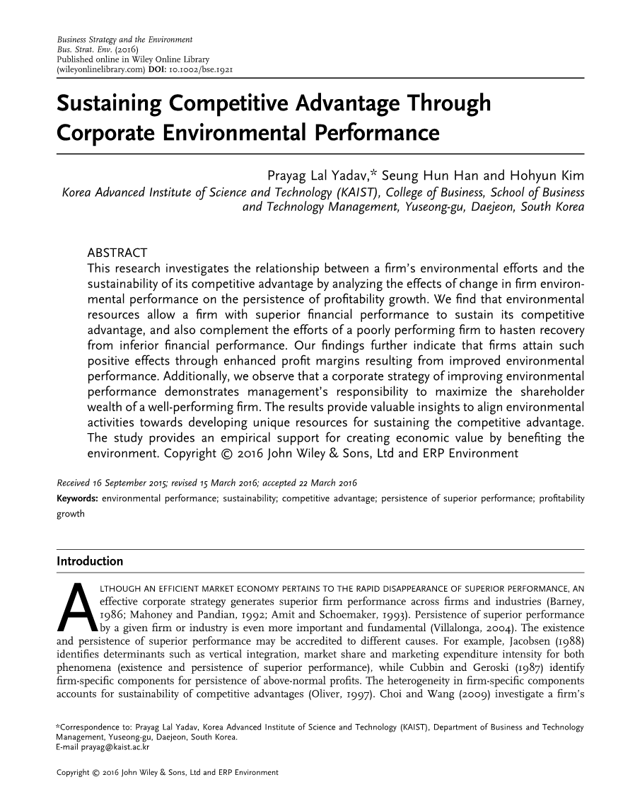 环境绩效;可持续性;竞争优势;卓越绩效的持续性;盈利增长
