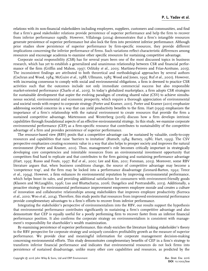 利益相关者理论建议,管理层应将股东和其他利益相关者的愿望内化到决策过程中(Freeman,1984;Ruf,2001)。在当今对气候变化日益关注的情况下,CEP可以被评估为一个公司的制度行为,根据利益相关者的充分确定的期望,其行动包括企业战略的社会合法性。CEP依赖于公司业务供应链上的许多因素,并且基于自然环境的考虑需要公司战略决策的一致和有意识的努力。战略管理文献表明,通过一个持续的组织过程来开发独特的资源,而随着时间的推移,重复的行动提供了可持续的竞争优势(Pentland和Rueter,1994)。这些资源是通过累积的经验在一个企业中开发的,并且依赖于路径(Dierickx和Cool,1989),这为竞争对手的复制创造了巨大的障碍。此外,Cohen和Levinthal(1990)认为,通过专门技术或专业知识开发的资源会不断创造新资源,使竞争对手更难模仿。Siltaoja(2014)最近对社会绩效的研究强调了创造私人知识对可持续发展的重要性,并建议企业的努力内部化以提高环境绩效和创造竞争优势。先前的研究建议通过改善环境绩效开发例如知识、人力资本、组织文化和创新等无形资源(Sureca,2010;Martensson和Westerberg,2016)。这些具有很强的不可比拟特性的资源通过提供一个可持续的竞争优势到公司增强CEP的价值(Lippman和Runelt,1982;福斯曼,2013)。