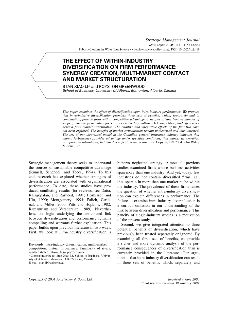 摘要:本文考察了多元化对企业内绩效的影响。 我们提出,产业内多元化通常有着三个优势,这些优势分别或者综合起来为企业提供竞争优势:范围经济产生的协同效应; 多市场竞争带来的相互宽容的溢价; 从市场结构中获得的效率和效率。 前两者的相加和综合效应还没有被探索。市场结构调整的好处还没有理论化,因此也没有经过检验。我们的理论模型在加拿大一般保险业的检验下表明,在特定的条件下,相互宽容提供了优势,市场结构也提供了优势,但多样化本身没有。