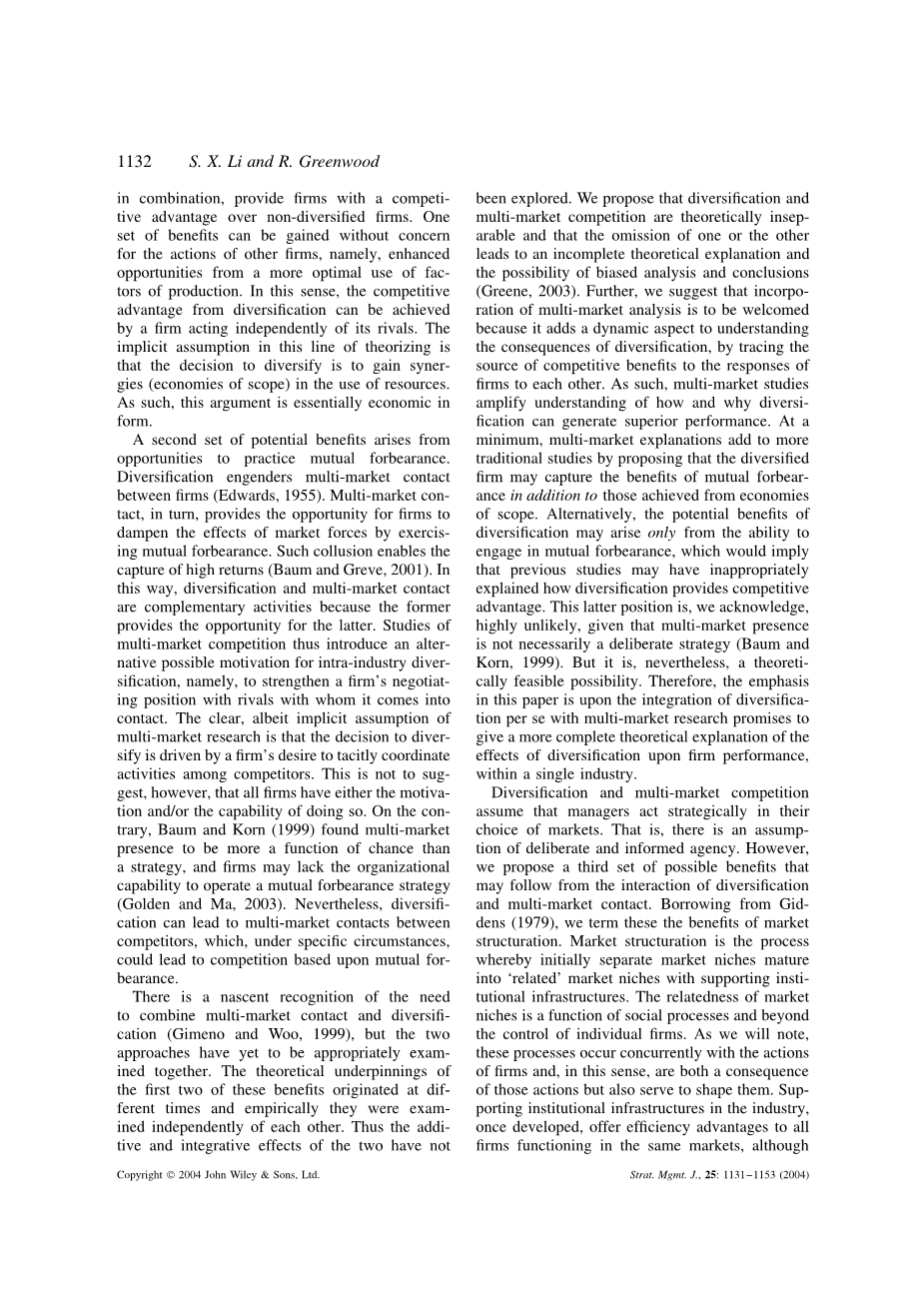 人们刚刚认识到需要将多市场接触和多元化战略结合起来(Gimeno和Woo, 1999),但这两种方法还没有得到适当的研究。前两项好处的理论基础是在不同的时期产生的,从经验上看,它们是相互独立的。因此,这两者的相加和综合效应尚未得到探索。我们认为,多元化和多市场竞争在理论上是不可分割的,两者缺少一个则会导致理论解释的不完整和偏倚分析得到偏差结论的可能性(Greene, 2003)。此外,我们建议将多市场分析结合起来是值得欢迎的,因为它为分析多元化的影响增加了一个动态方面,通过追踪竞争利益的来源来了解各公司对彼此的反应。因此,多市场研究扩大了对多元化如何以及为什么能够产生卓越业绩的理解。至少,多市场的解释增加了传统的研究,提出多样化的公司除了从范围经济中获得的好处外,还可以从相互容忍中获得好处。或者,多样化的潜在好处可能只来自相互容忍的能力,这意味着以前的研究可能不适当地解释了多样化如何提供竞争优势。我们承认,后一种立场是非常不可能的,因为多市场的存在不一定是一个深思熟虑的战略(鲍姆和科恩,1999)。但无论如何,这在理论上是可行的。因此,本文的重点在于将多元化本身与多市场研究相结合,以期对单一行业内多元化对企业绩效的影响做出更完整的理论解释。
