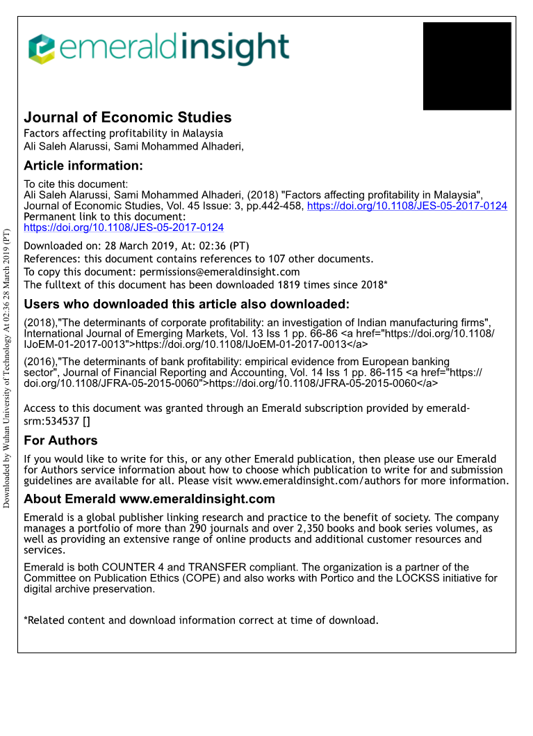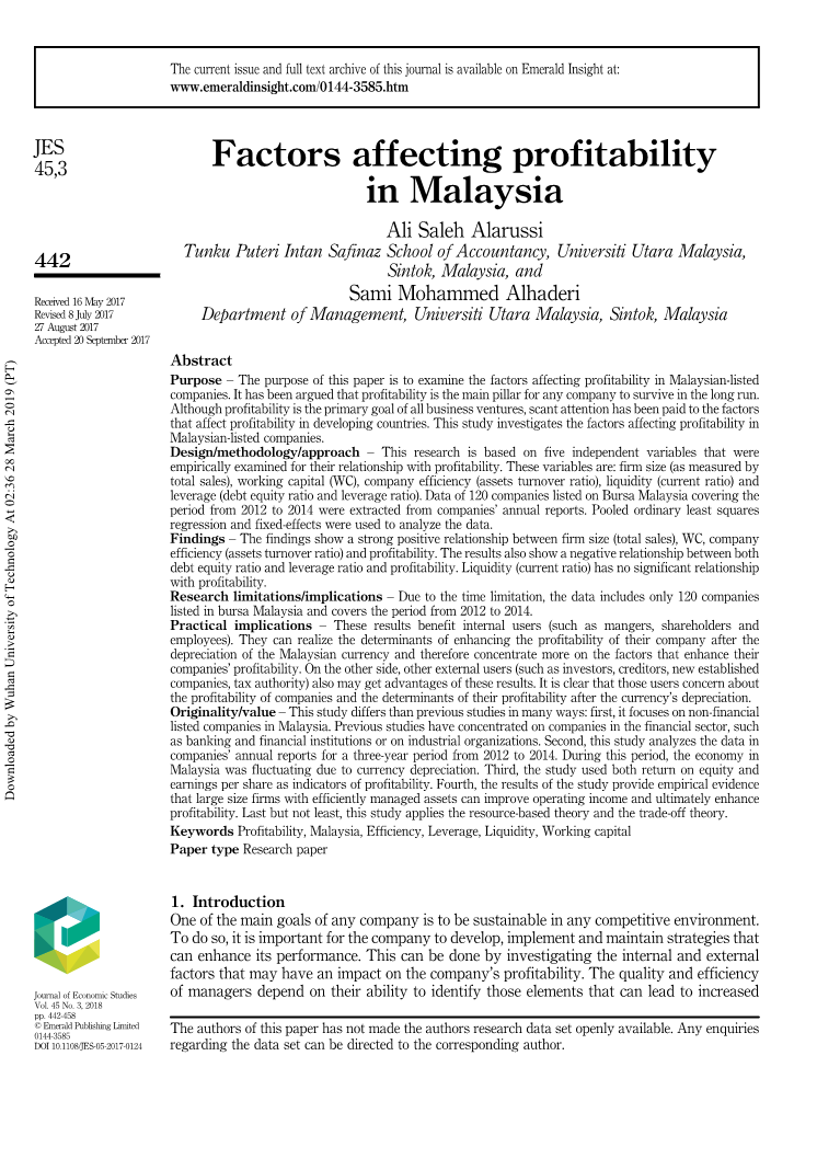 Ali Saleh Alarussi, Sami Mohammed Alhaderi, (2018) 'Factors affecting profitability in Malaysia',