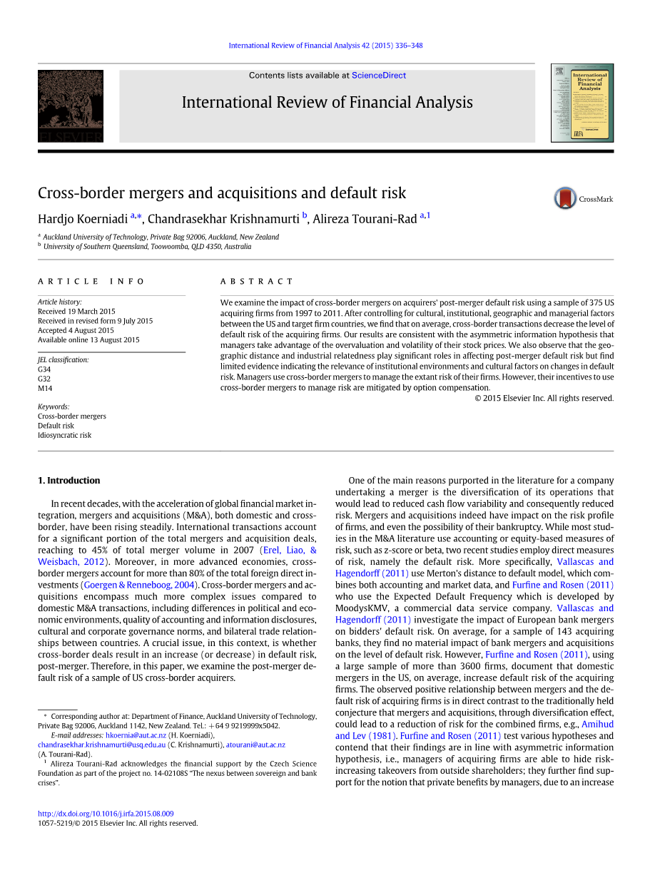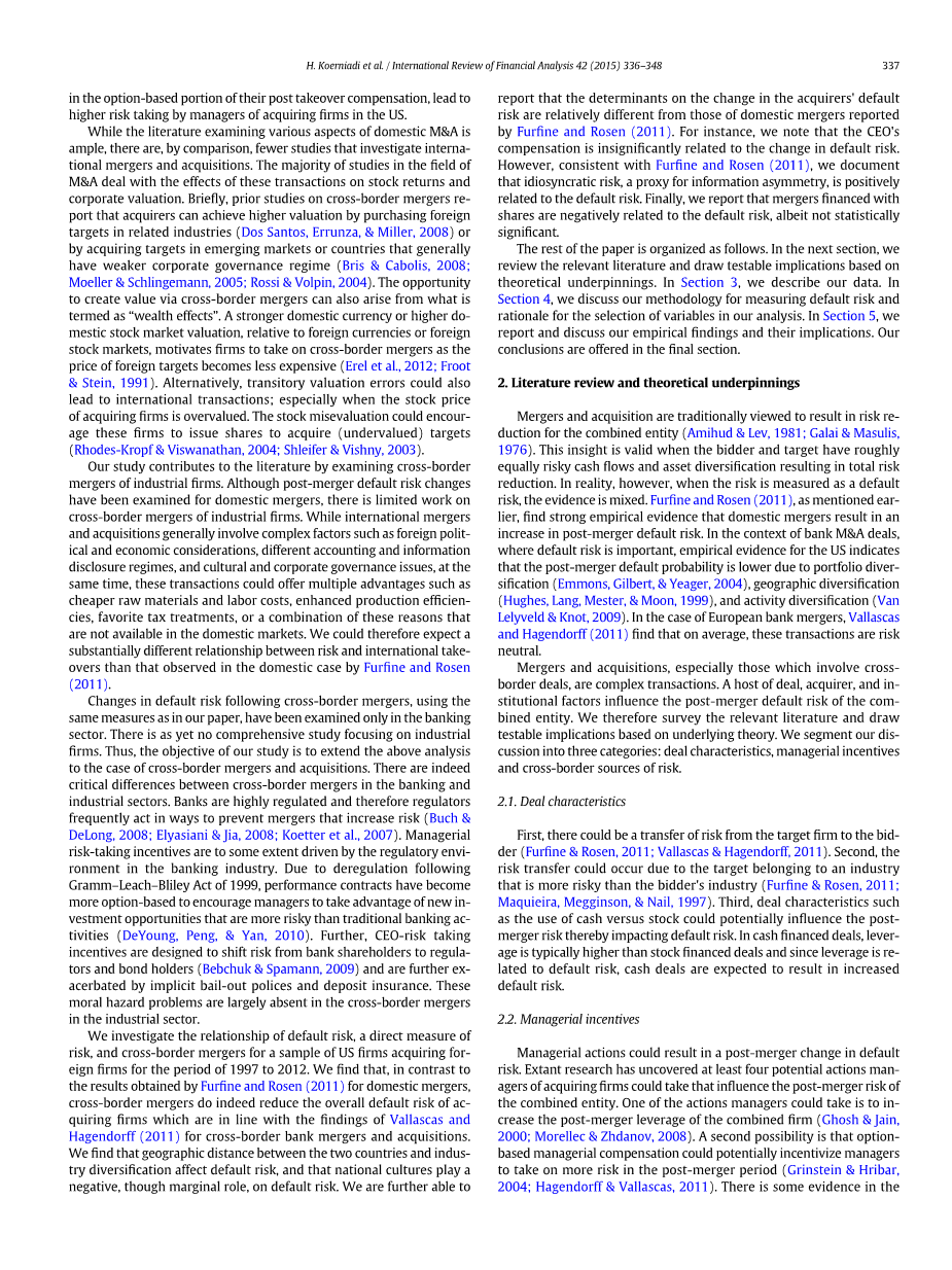 近几十年来,随着全球金融市场一体化进程的加快,国内外并购活动不断增加。国际交易占并购交易总额的很大一部分,在2007年达到并购交易总额的45% (Erel, Liao, Weisbach, 2012)。此外,在更发达的经济体中,跨境并购占外国直接投资总额的80%以上(Goergen Renneboog, 2004)。与国内并购交易相比,跨境并购包含的问题要复杂得多,包括政治和经济环境的差异、会计和信息披露的质量、文化和公司治理规范,以及国家间的双边贸易关系。在这种背景下,一个关键问题是,跨境交易是否会导致合并后违约风险的增加(或减少)。因此,在本文中,我们研究了一个美国跨境收购者的合并后违约风险的样本。