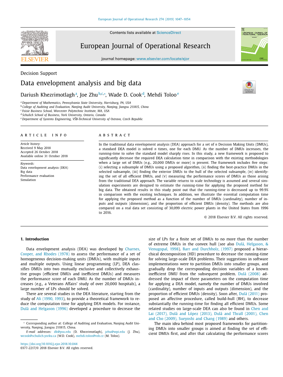数据包络分析(DEA)由Charnes,Cooper和Rhodes(1978)开发,用于评估一组具有多个输入和多个输出的同质决策单元(DMU)的性能。使用线性规划(LP),DEA将DMU分为两个互斥和集体详尽的组(有效的DMU和低效的DMU),并测量每个DMU的性能分数。随着DMU数量的增加(例如,退伍军人事务部对超过20,000家医院的研究),应该解决大量的LPs。在DEA文献中有几项研究,从Ali(1990,1993)的研究开始,提供理论框架,以减少应用DEA模型的计算时间。例如,Dulaacute;和Helgason(1996)开发了一种程序,将有限DMU的LPs数量减少到不超过凸壳中极端DMU的数量(参见Dulaacute;,Helgason,&Venugopal,1998)。 Barr和Durchholz(1997)提出了一种分层分解(HD)程序,以减少解决大规模DEA问题的运行时间。他们在软件实现中的建议是将DMU分成更小的组,并逐渐从随后的问题中删除已知的低效DMU的相应决策变量。 Dulaacute;(2008)讨论了三个参数对应用DEA模型的计算时间的影响,即所涉及的DMU数量(基数),输入和输出数量(维度)以及有效DMU(密度)的比例。不久之后,Dulaacute;(2011)提出了一种名为build-hull(BH)的情感程序,以大大减少寻找所有高效DMU的运行时间。关于大规模DEA的一些相关研究也可以在Chen和Lai(2017),Dulaacute;和Loacute;pez(2013),Dulaacute;和Thrall(2001),Chen和Cho(2009),Sueyoshi和Chang(1989)等中找到。大多数提议的将DMU划分为较小组的框架背后的主要思想是首先找到一组有效的DMU,然后计算低效DMU的性能得分(例如参见Barr&Durchholz,1997,Korhonen&Siitari,2009)。虽然减少大数据集存在时的计算时间的关键是识别所有有效的DMU,但随着维数的增加,样本的密度增加,找到有效DMU集的运行时间也会增加(例如,见Chen&Cho,2009,Dulaacute;,2008)。因此,计算所有DMU的DEA分数的运行时间可能很长。